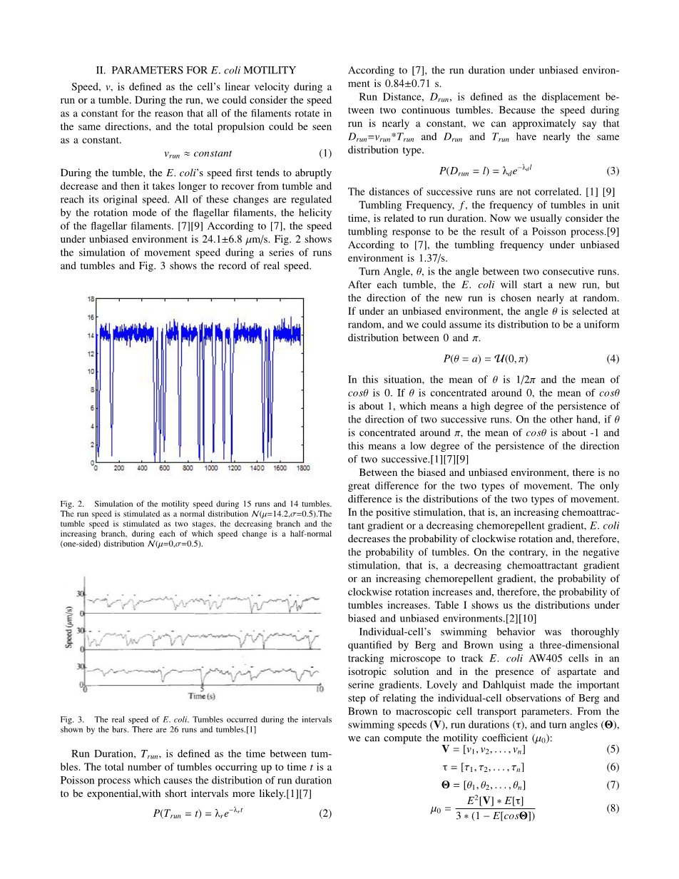 连续运行的距离不相关。[ 1 ] [ 9 ]翻滚的频率,F、单位跌倒的频率时间,与运行时间有关。现在我们通常考虑翻滚反应是泊松过程的结果[ 9 ]根据[ 7 ],翻滚频率下无偏环境是1.37/s。转角,是两个连续运行的角度。每次跌倒后,大肠杆菌会开始一个新的运行,但新运行的方向几乎随机选择。如果在一个公正的环境下,角度选择随机的,我们可以假定它的分布是均匀的分布在0和pi;。