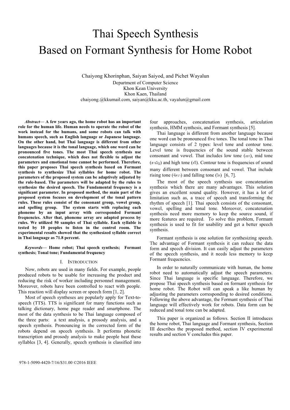 关键词 - 家用机器人; 泰语语音合成; 共振峰合成; 音调; 基本频率