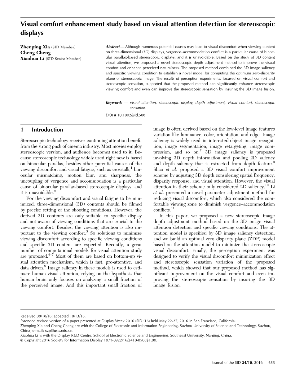 在浏览三维(3D)显示的内容时,虽然众多潜在原因可能导致视觉不适,在立体显示双目并用时,辐辏和调节的矛盾是一个特有的原因。基于3D内容视觉注意力的研究,我们提出了一个新颖的立体深度调整的方法来改善视觉舒适度和提高感知自然度。该方法结合了三维图像显著性和特定的观看条件建立一个新的模型,计算最优零视差平面立体的形象。关注视觉舒适度和立体感的感知实验的结果表明,该方法可以显著提高立体视觉舒适度,甚至可以提高立体感觉在保证3D图像融合的前提下。