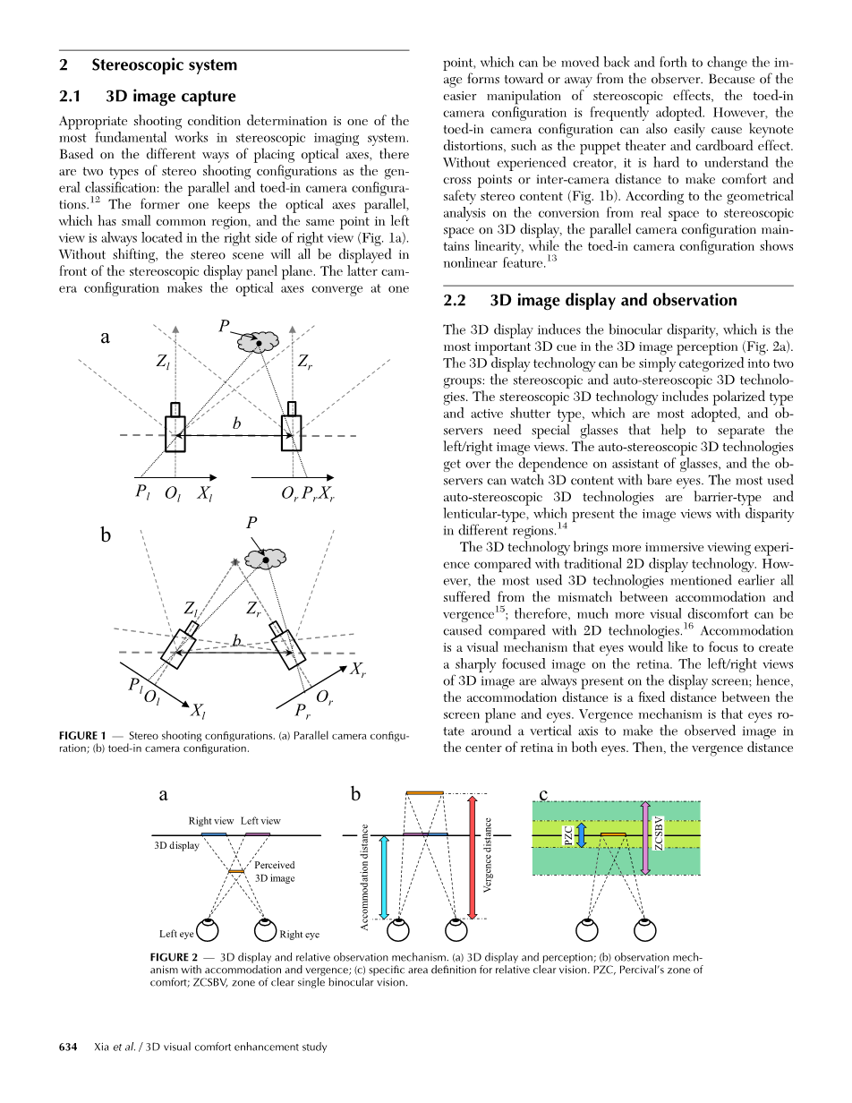 与传统的2D显示技术相比,3D技术带来更多的身临其境的观看体验。然而,最常用的3D技术,前面提到的所有遭受调节与辐辏之间的不匹配;因此,与2D技术相比更可能引起视觉不适。调节是一个视觉机制,眼睛想集中在视网膜上创建一个清晰的聚焦图像。左/右视图的三维图像总是出现在显示屏;因此,调节屏幕平面和眼睛之间的距离是一个固定的距离。转向机制是眼睛围绕一个垂直轴旋转在双眼视网膜中心使观察到的图像。然后,在三维显示观察的视线距离是从眼睛到眼睛的视线线交点的距离(图2b)。根据左视图和右视图之间的差距,感知的3D图像可以融合在前面的显示(负视差),在显示器的背面(正视差),甚至在平面上的显示时,左视图和右视图彼此重叠(零视差)。调节和辐辏的矛盾通常导致视觉不适和眼部疲劳。更多的调节和辐辏的矛盾的差别,就会有更多的视觉不适和视觉疲劳的发生。根据前面的感知研究,有一个特定的领域对象可以比较清楚地看到,和保持双眼融合的定义是明确区单双目视觉。除此之外,一个较小的区域,大约三分之一的区域清晰的单一的双目视觉,被定义为珀西瓦尔(Perciva) 的舒适区(图2 c),调节和聚散度反应可以实现没有不适。