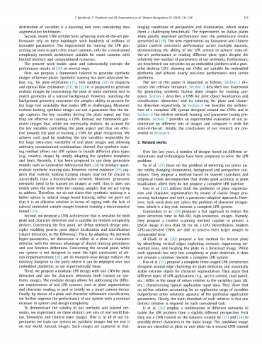 本文的其余部分安排如下。 第2节讨论了相关文献。 第3节描述了我们为培训目的生成合成车牌图像的框架。 第4节描述了用于联合对象定位和分类(检测)的CNN及其针对板和特征检测的定制。 在第5节中,我们描述了围绕CNN设计的完整LPR系统的架构,以及第6节中的相关网络训练和参数调整程序。 第7节提供了我们对不同图像集的架构的实验评估,并将其与现有技术进行了比较。 最后,我们的研究结论在第8节中介绍。