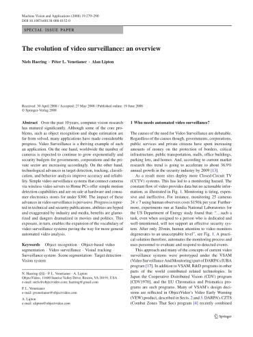 摘要 在过去的10年里,计算机视觉研究已经十分成熟。虽然一些核心问题,如物体识别和形状估计还远未得到解决,但许多应用已经取得了相当大的进展。视频监控就是这种应用的一个蓬勃发展的例子。一方面,全球摄像机数量预计将继续呈指数级增长,政府、企业和私营部门的安全预算也相应增加。另一方面,在目标检测、跟踪、分类和行为分析方面的技术进步提高了准确性和可靠性。简单的视频监控系统通过无线视频服务器将摄像头连接到家用电脑上,提供简单的运动检测功能,在硬件和消费电子商店以低于300美元的价格出售。这些先进的视频监控技术的影响是普遍存在的。技术和安全出版物反映了此技术的进步,工业和媒体大肆宣传并夸大了其能力,电影和政治美化了其利益,渲染了其危险。这种曝光反过来又使视频监控系统这一词汇得以扩展,为更一般的自动化视频分析铺平了道路。