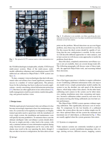 这种方法和当前视频监控系统的许多概念都是在DARPA的IUBA计划的VSAM(视频监控和监控)部分下原型化的。除了VSAM之外,世界其他地区的研发项目还提供了相关技术。在日本,合作分布式视觉(CDV)项目[CDV1970]和欧盟的色度学和棱镜图就是这样的项目。许多VSAM的设计决策都反映在ObjectVideo的视频预警(VEW)产品中,如第2部分和第3部分所述。最近DARPA的CZTS(所见作战区)项目在可部署、可靠、基于COTS的多传感器系统中的应用中结合了VSAM技术。许多多传感器、多模态、校准、鲁棒性和已解决的可视化问题CZTS都反映在ObjectVideo的VEW系统中(参见第4部分)。