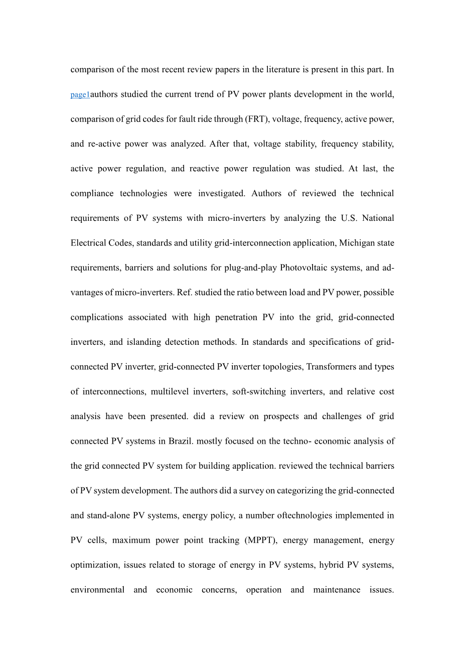 他们对文献中的光伏并网发电系统进行了大量的研究。本部分介绍了文献中最新的评论文章的比较。在研究了世界光伏电站发展的当前趋势的基础上,分析了电网故障穿越(FRT),电压,频率,有功功率和有功功率的比较。然后研究了电压稳定性、频率稳定性、有功功率调节和无功功率调节。最后对合规技术进行了调查。作者综述了微逆变器的光伏并网发电系统的技术要求,通过分析美国国家电气规程、标准和电网的互联应用,密歇根州的要求,即插即用光伏系统的障碍和解决方案,以及微逆变器。研究了负载与光伏功率之间的比率,与高入射光伏入网,并网逆变器和孤岛检测方法相关的可能的并发症。在标准和规格的逆变器并网光伏发电,光伏并网逆变器的拓扑结构,变压器和类型的互连,多电平逆变器软开关逆变器,和相对成本进行了分析。对巴西并网光伏系统的前景和挑战进行了回顾。主要集中在光伏并网发电系统的技术经济分析。回顾了光伏系统发展的技术壁垒。作者进行了关于并网和独立光伏系统分类,能源政策,光伏电池实施的多项技术,最大功率点跟踪(MPPT),能源管理,能源优化,能源储存相关问题的调查在光伏系统,混合光伏系统,环境和经济问题,操作和维护问题。参考文献提供的分析、解释,并对典型的分布式MPPT的介绍和集中式MPPT。在并网光伏发电系统的准则和标准中,研究了大规模光伏并网在电网中的作用,电能质量要求,保护方法和控制能力。可以看出,每篇论文大多只关注光伏技术规范的有限方面,目前还没有全面的综述。