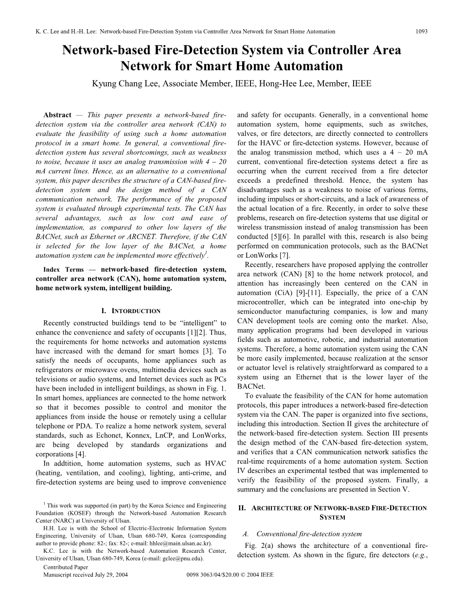 本文介绍了一种基于CAN的火灾报警网络,并评估了其可行性。本文包括本段引言,一共有五个部分。在第二部分,文章给出了本系统的网络架构。第三部分提出本系统的设计方法并证明了本系统可以满足家庭自动化系统的实时性需求。第四部分介绍了本系统的可行性验证试验。