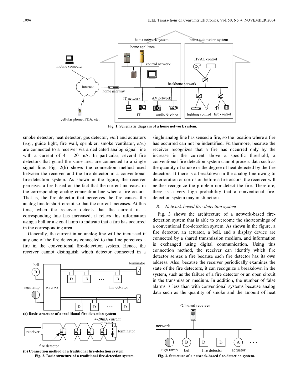 另外,为了提高人们生活的舒适与安全,我们正在完善如强电控制、照明、防盗、火灾报警等家庭自动化系统。通常,在传统的家庭自动化系统中,开关、阀门或者火灾探测器都直接与空调设备或火灾报警系统相连。传统火灾告警系统采用4~20mA电流的模拟传输方式,当从火灾探测器接受的电流信号超过阈值,我们就判定发生火灾。因此,该系统存在一些不足,它容易受到包括尖脉冲等不同形式的干扰,同时它不能判断实际的燃火点。为了解决这些问题,业界已经开始研究用数字、无线传输技术的系统替代以往模拟传输的系统5-6。同时也在BACNet、LonWorks等方案中研究确定本系统所要使用的通信协议7。
