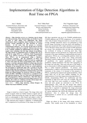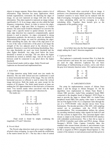这里我们比较Nano板2的计算能力使用MATLAB。我们还比较了获得的结果通过软件和硬件(ASP)进行边缘检测图2显示了原始图像,图3,图4,图5显示FPGA的硬件边沿检测输出。通过硬件实现边缘检测时Altium,获得的输出是实时的,它不会跳过任帧在输出中观察到每秒近24帧。但在软件边缘的情况下,结果并不令人满意检测。一般32位的计算能力与ASP设计相比,处理器TSK 3000非常低使用CHC。以每秒近2帧的速度获得输出使用TSK 3000.在MATLAB中使用相同的算法实现与VGA相同分辨率的图像视频。结果总结在下表I中。