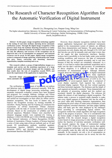 如果需要人来手动处理,仪器的检验和评估是繁琐和繁重的任务。随着一些数字图像处理技术的发展,一些自动仪器评估系统已经被提出并设计了。例如,Rahman Ashfaqur和Venna Brijesh [1]提出了所谓的集合分类器架构并对其对离线草书字符识别的作用进行了调查。四级特征集可以通过训练分类器的集合来提高识别准确度。 黄鹤鸣和大飞鹏[2]利用小波变换和不变矩进行了离线手写藏文字符识别实验。 根据音节的构造及其允许的序列,普通话被分类,字符语言模型被利用[3]。针对数据库CASLA-OLHWDB和CASIA-HWDB,国家模式识别实验室(NLPR)的研究人员,中国科学院自动化研究所启动使用最先进的方法开展了一系列试验,如ID和伪二维非均化方法,修正二次方法判别函数(MQDF),判别特征提取(DFE)和判别学习二次方判别函数(DLQDF)[4]。