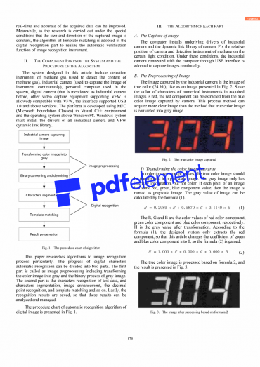 然而,那些字符识别方法有它们的独特的应用背景,应用于工业测量系统的传统仪器不同于那些字符和特征。绝大多数仪器不仅仅只能通过LCD,LED和拨号显示数据,而且只能手动读取,更重要的是,他们不提供数据传输接口。 因此,很难实现数据自动采集并确保数据的实时性和准确性。考虑到上述情况,满足测量系统自动化的需要是很难的。虽然国内对计算机视觉辅助数字仪器自动识别的研究不多,但提出了许多重要的方法。 例如,根据[5]中对LED的字符给出了处理方法。七段数码管的特点是由七个显示段组成。 每个部分具有垂直或水平显示段,四个垂直段和三个水平段。 每个段的厚度和长度基本一致。这些特征是处理方法的原理,这种方法可以准确地识别数字字符。参考文献[6]采用单位采样方案进行数字识别。该方案制定了获得单个字符的过程确保每个数字段的字符在完成字符分割后只有一个像素值的宽度,确定每个含有字符的数字段中心点坐标的像素值,然后判断照明状态,最后根据相应的逻辑关系得到字符块显示的值。 这个识别方法算法简单,在识别过程中识别速度快。 考虑到数字仪器特征识别算法的研究[7,8],研究设计了一种基于图像处理的数字识别系统,以使系统能够很好地实现实时自动验证的功能。该研究通过VFW(Video for Windows)相机获得了了器乐阅读的图象然后应用数字识别技术处理捕获的图像,最终用仪器读取数据而不是手动。 在研究中,不仅很多人力和物力的消耗可以节省,也可以提高采集数据的实时性和准确性。同时,由于研究是在特殊的情况下进行的捕获图像的大小和方向是不变的,在数字识别部分采用模板匹配算法实现自动验证图像识别仪器的功能。