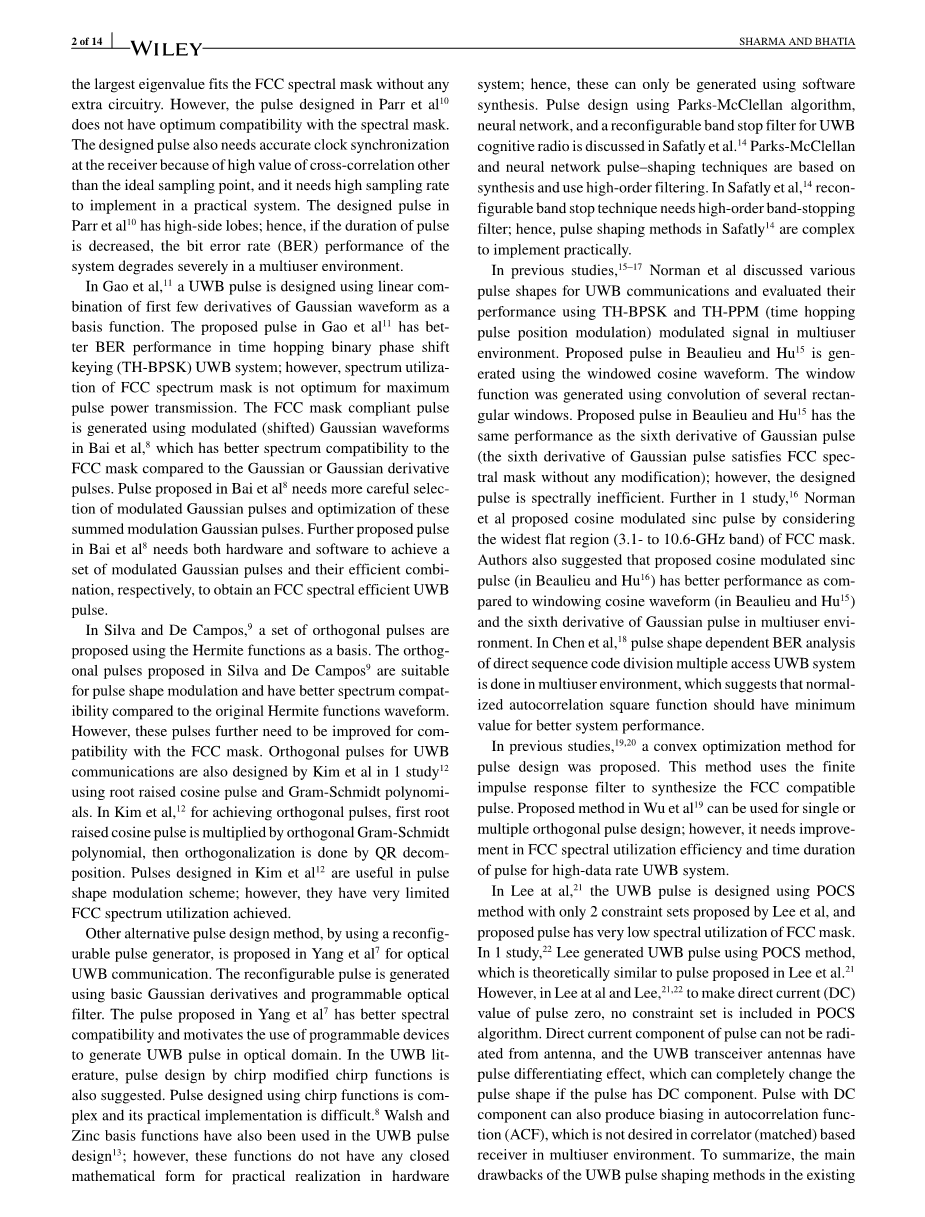 在先前的研究中,Norman等人讨论了用于超宽带通信的各种脉冲形状,并且在多用户环境中使用TH-BPSK和TH-PPM(时跳脉冲位置调制)调制信号评估了它们的性能。Beaulieu和Hu文献中推荐的设计脉冲是使用加窗余弦波形生成的。窗口函数是使用几个矩形窗口的卷积生成的。Beaulieu和Hu中设计的脉冲方式具有与高斯脉冲的六阶导数相同的性能(高斯脉冲的六阶导数满足FCC光谱掩模而没有任何修改);然而,这种脉冲在频谱上效率很低。在进一步的研究中,Norman等人通过考虑FCC掩模的最宽平坦区域(3.1到10.6GHz频带)提出了余弦调制sinc脉冲方式,我们(作者)认为,与开窗余弦波形(Beaulieu和Hu)和高斯脉冲在多用户环境中的六阶导数相比,提出的余弦调制sinc脉冲(在Beaulieu和Hu中)具有更好的性能。在Chen等人的文章中,在多用户环境下完成了直接序列码分多址超宽带系统的脉冲波形相关的误码率分析,这表明归一化自相关平方函数应该尽量取最小值以获得更好的系统性能。在之前的研究中,提到过一种脉冲设计的凸优化方法,该方法使用有限脉冲响应滤波器来合成FCC兼容脉冲。Wu等人提出了一种方法可以用于单个或多个正交脉冲的设计;然而,对于高数据速率超宽带系统,这种方式对FCC频谱的利用效率和脉冲持续时间需要改进。在Lee等人的论文中,超宽带脉冲是利用Lee等人提出的仅有2个约束集的POCS方法实现的,并且所设计的脉冲对FCC掩模的频谱利用率非常低。在另一项研究中,Lee使用了POCS方法产生超宽带脉冲,这在理论上与Lee等人提出的用约束集产生脉冲类似。然而,在Lee和Lee的论文中,为了使脉冲零的直流(DC)值,POCS算法中没有包含约束集。而脉冲的直流分量不能从天线中辐射出去,超宽带收发天线具有脉冲差分效应,脉冲如果具有直流分量,会完全改变脉冲形状,而具有直流分量的脉冲也可以在自相关函数(ACF)中产生偏置,这在多用户环境中的相关器(匹配)接收器中是不希望看到的。文献如下:(1)使用Gaussian,Hermite和Prolate的脉冲设计方法球形函数需要与FCC频谱模板达到最佳兼容性;(2)基于有限脉冲响应的脉冲设计方法修改基本脉冲形状的频谱以适合FCC掩模;然而,需要进行多项试验,因为没有封闭的形式限制可用;(3)整个FCC频谱掩模在脉冲设计中很少被利用;(4)现有的方法很少能够产生FCC兼容脉冲,但由于其刚性,对于任何改进的掩模的脉冲设计也难以直接实施;(5)基于POCS的脉冲设计方法需要更多的约束集和更好的脉冲形状设计的独特框架;(6)少部分方法需要高采样率,增加了实施成本。