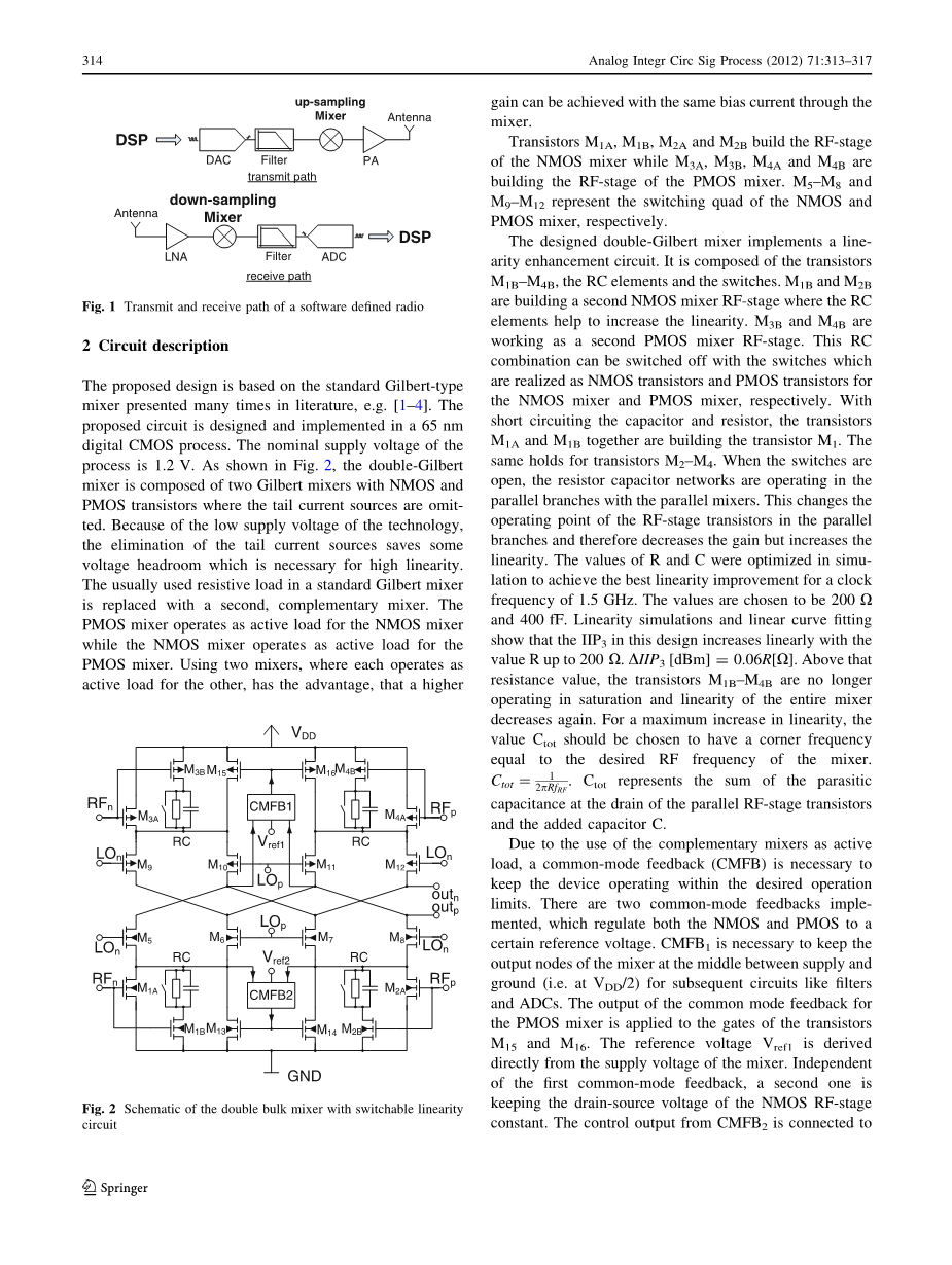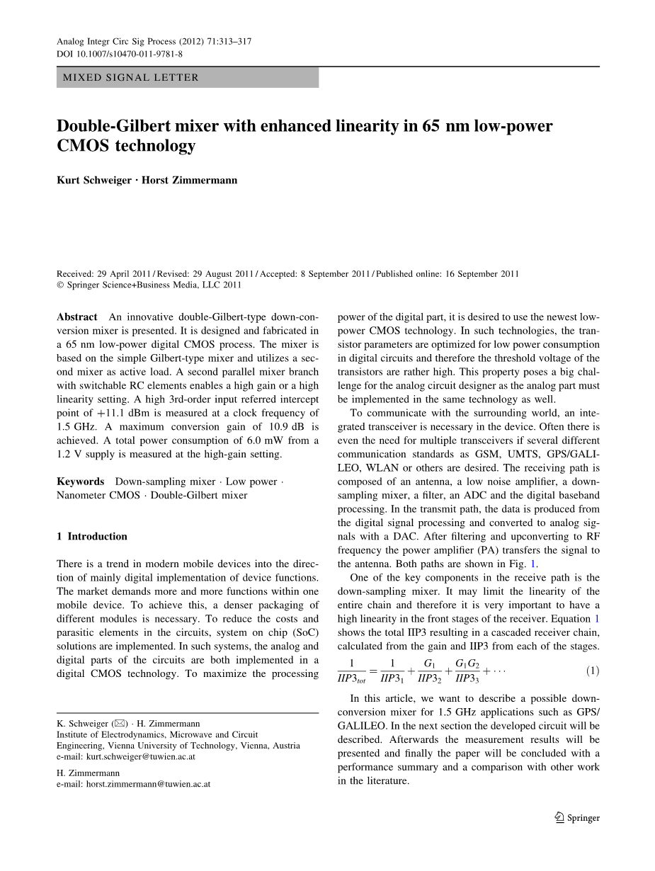 关键词 下采样混频器、低功率、纳米CMOS技术、双吉尔伯特混频器