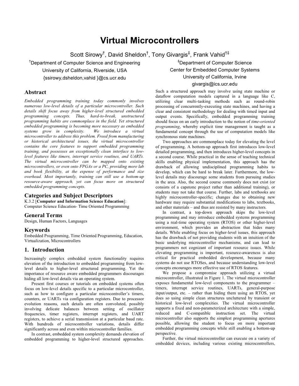我们提出了一种利用虚拟微控制器的折衷方法,如图1所示。虚拟微控制器为程序员提供基本的低级组件——定时器,中断服务程序,UART,通用输入/输出等——而不是隐藏它们去使用实时操作系统,它仍然可以使用简单的结构,不受瞬时或历史低级复杂性的影响。 虚拟微控制器支持固定和非参数化架构,并具有简单的、简化的和C兼容的指令集。虚拟微控制器还支持最简单的编程途径,使学生能够专注于更重要的嵌入式编程概念,同时仍能实现自下而上的方法。