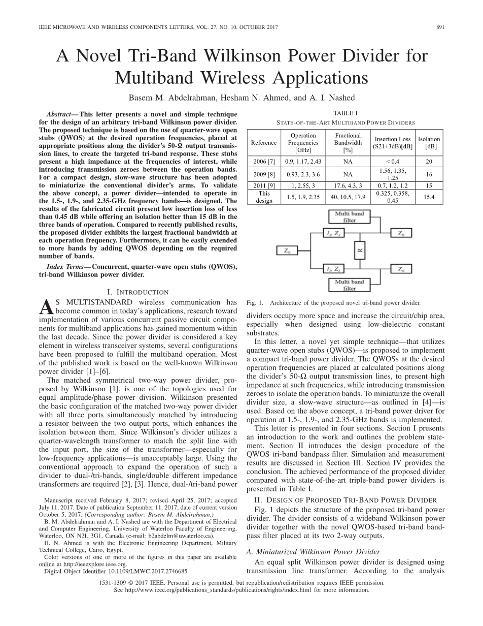 一种新型多波段无线应用的三波段威尔金森功率分配器外文翻译资料