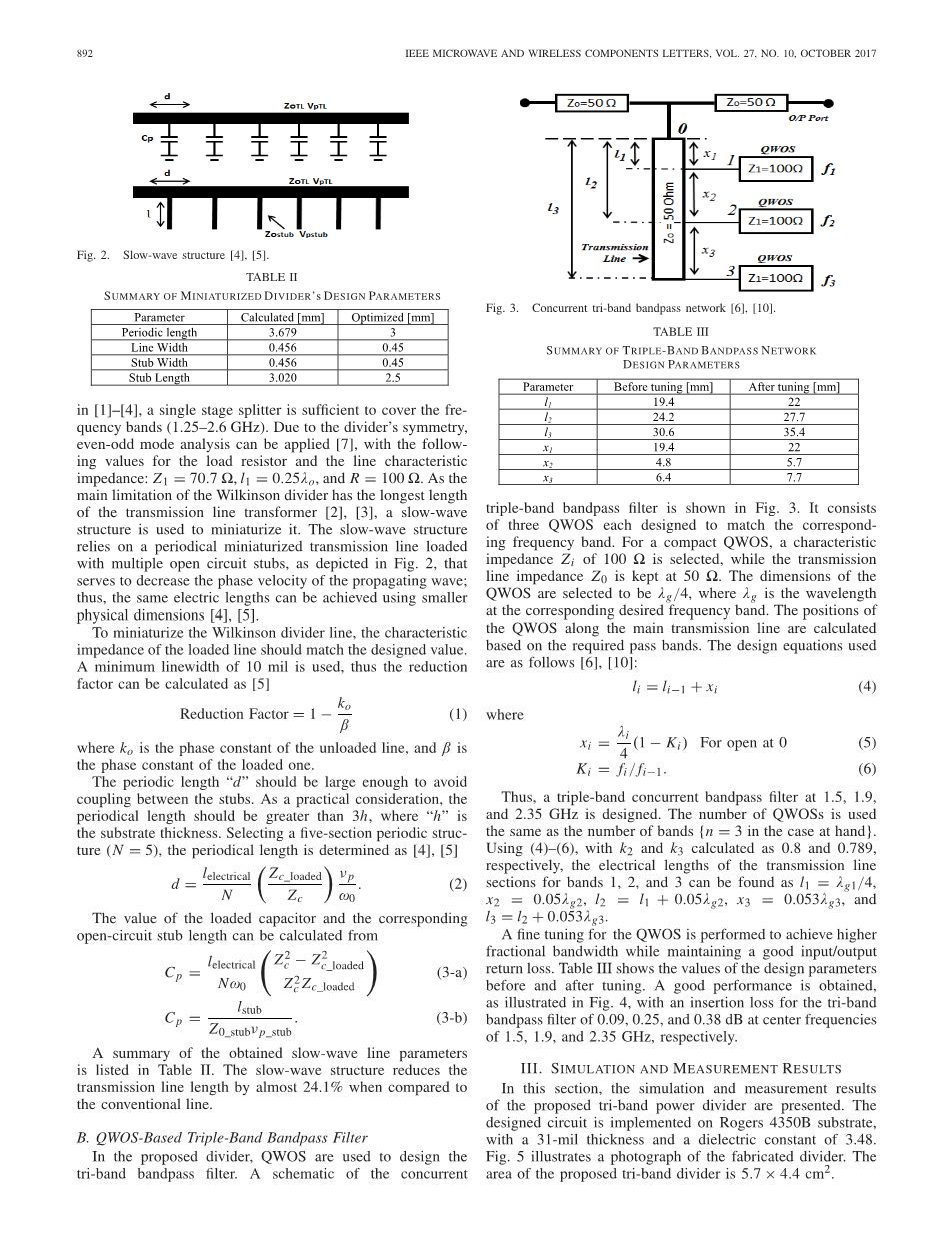 本文总共分为四节。第一节介绍了这项工作的基本内容,并概述了所研究的问题的现状。第二节介绍了QWOS三波段带通滤波器的设计过程。第三节讨论了仿真和测量结果。第四节是给出结论。与目前最先进的三波段功率分配器相比,所提出的分频器的性能见表1: