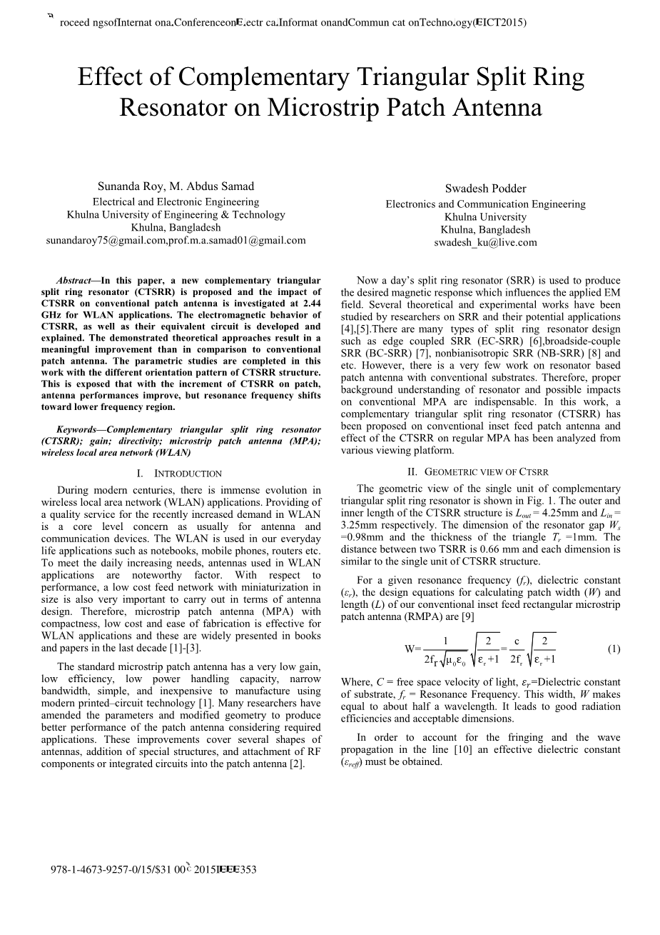 关键字—互补三角形开口谐振环(CTSRR);增益;方向性;微带贴片天线(MPA);无线局域网(WLAN)