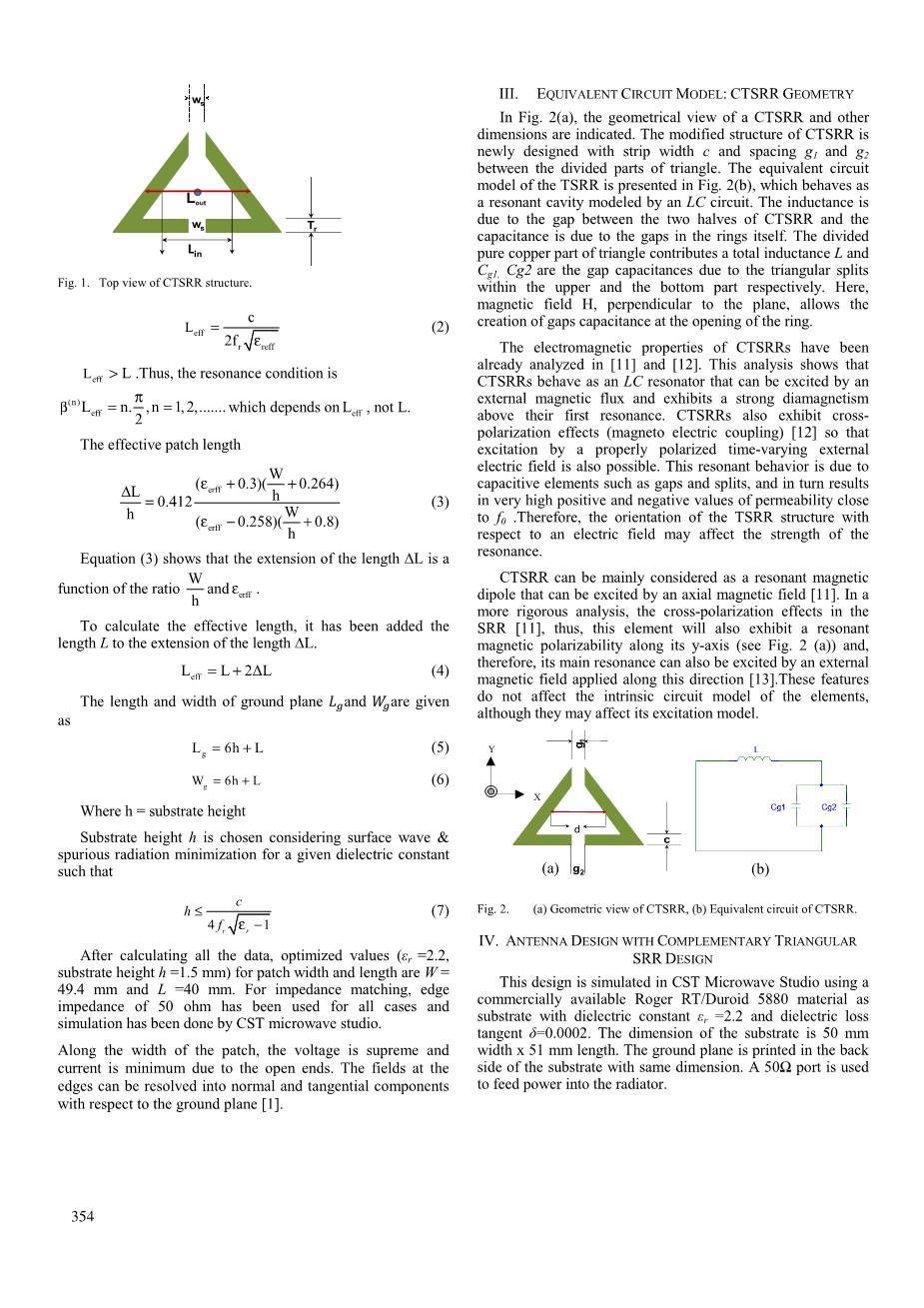 现在的开口谐振环(SRR)多用于产生影响施加电磁场的所需磁响应。SRR研究人员及其潜在应用研究了几项理论和实验研究[4],[5]。有许多类型的开口谐振环设计,如边缘耦合SRR(EC-SRR)[6],宽边对 SRR(BC-SRR)[7],非双向各向异性SRR(NB-SRR)[8]等。然而,基于谐振器的贴片天线与常规基板有很少的关系。因此,对谐振器的正确背景了解以及对常规MPA的可能影响是必不可少的。在这项工作中,已经提出了一种互补的三角形开口谐振环(CTSRR)结构,常规插入馈电贴片天线,并且从各种观察平台分析了CTSRR对常规MPA的影响。