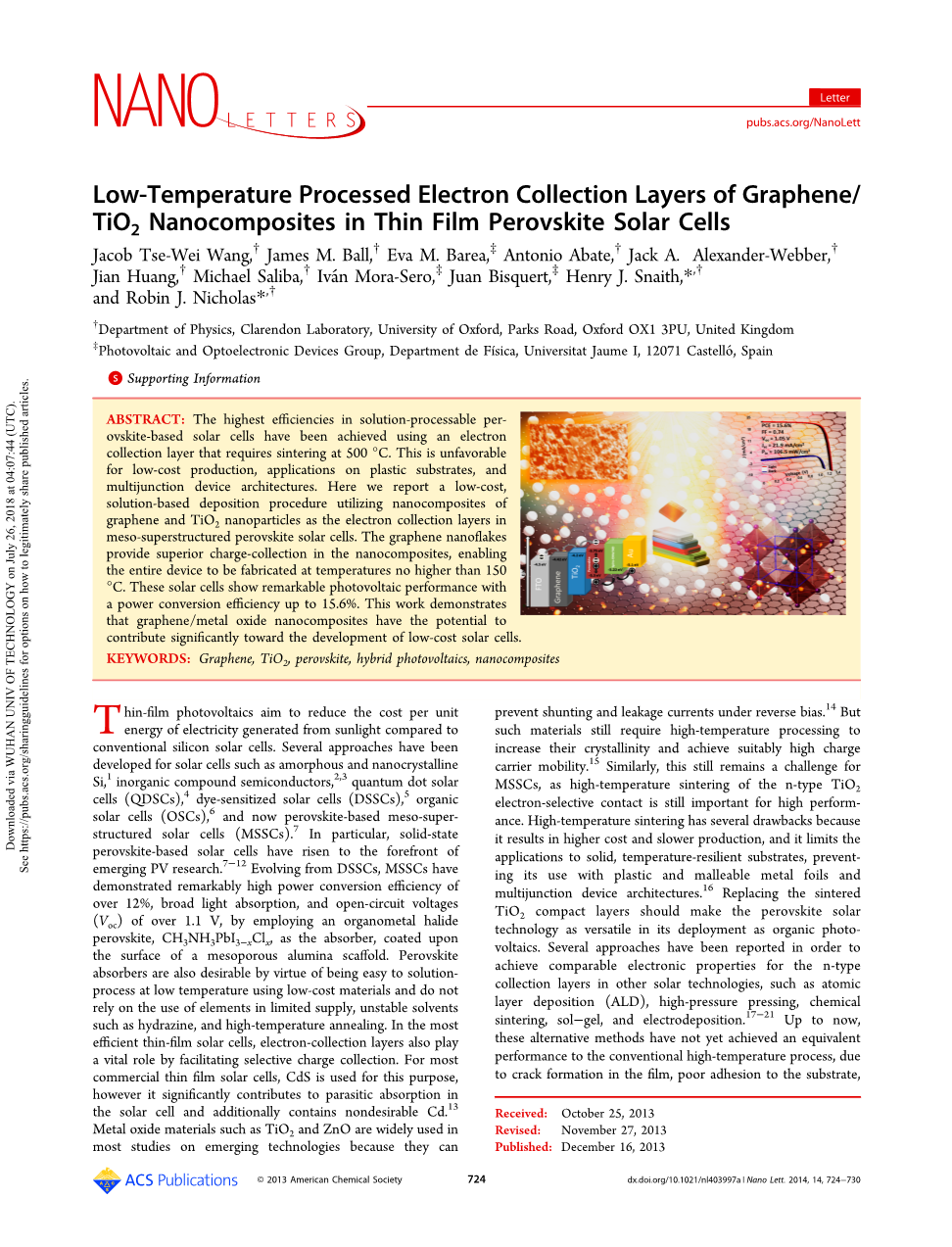 薄膜钙钛矿太阳能电池中石墨烯TiO2纳米复合材料的低温处理电子收集层