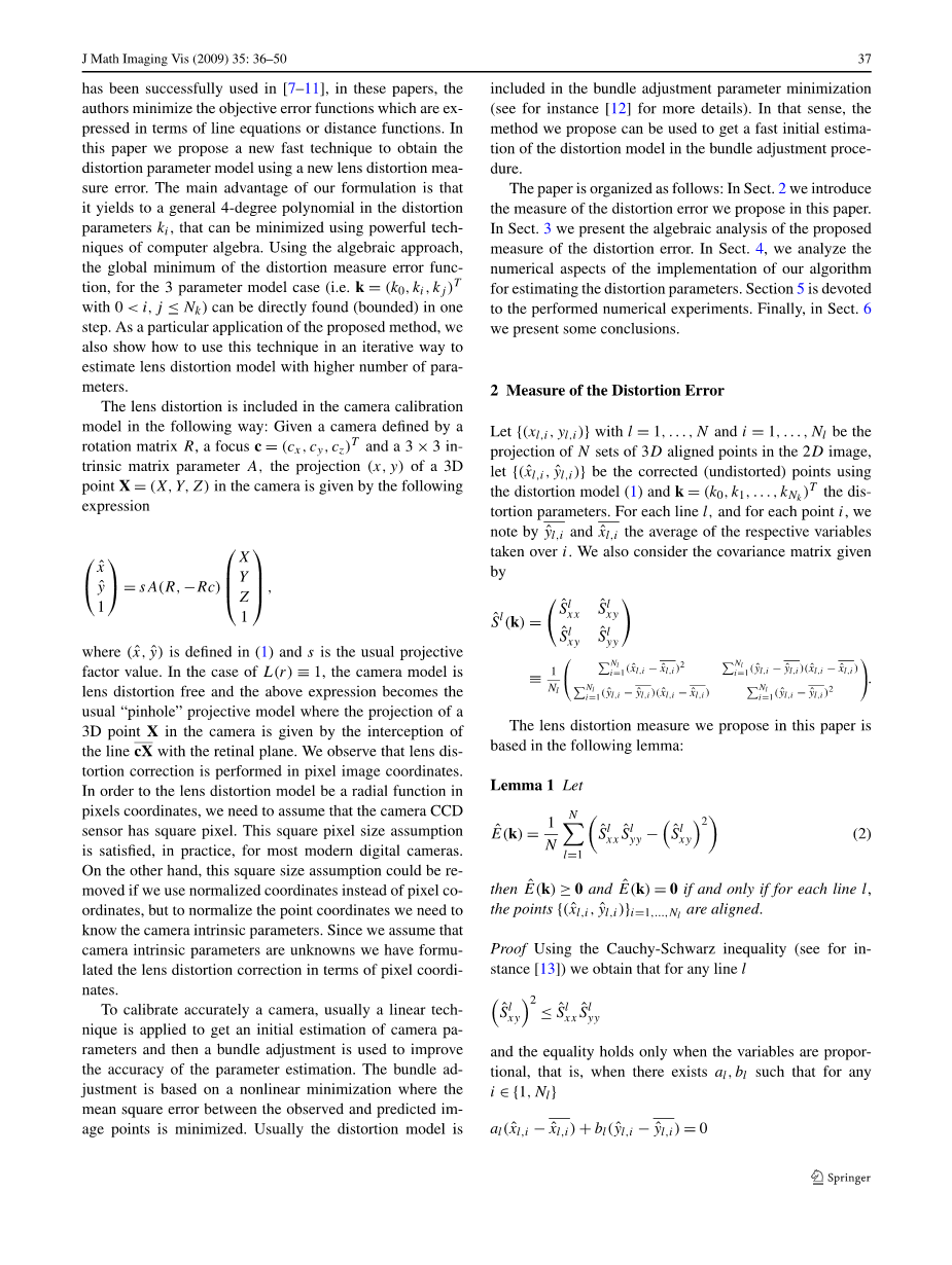 令(其中且)是N个3D对齐点在投影中的投影。在2D图像中,使为使用变形模型(1)的校正点(不失真),并且失真参数。对于每条线l和每一个点i,我们用和表示,接管i的各个变量的平均值。我们还考虑由我们在本文中提出的镜头畸变度量基于以下引理: