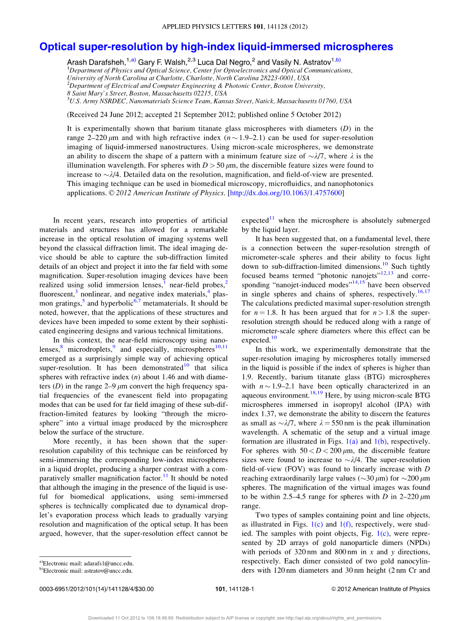 作者在此感谢M. A. Fiddy,I.Vitebskiy,V.Kovanis和D. M. Whittaker的讨论,感谢A. D. Davies的共享高NA显微镜物镜,以及MOSCI Corporation捐赠了一些用于这项工作的微球,这项研究由美国陆军研究办公室(ARO)通过合同号为W911NF-09-1-0450的J. T. Prater博士和美国国家科学基金会(NSF)根据项目号ECCS-0824067进行了支持。制造工作由美国陆军Natick士兵中心根据合同号提供支持。W911NF-07-D-001和SMART奖学金项目,并已被批准公开发布NSRDEC PAO#U12-307。