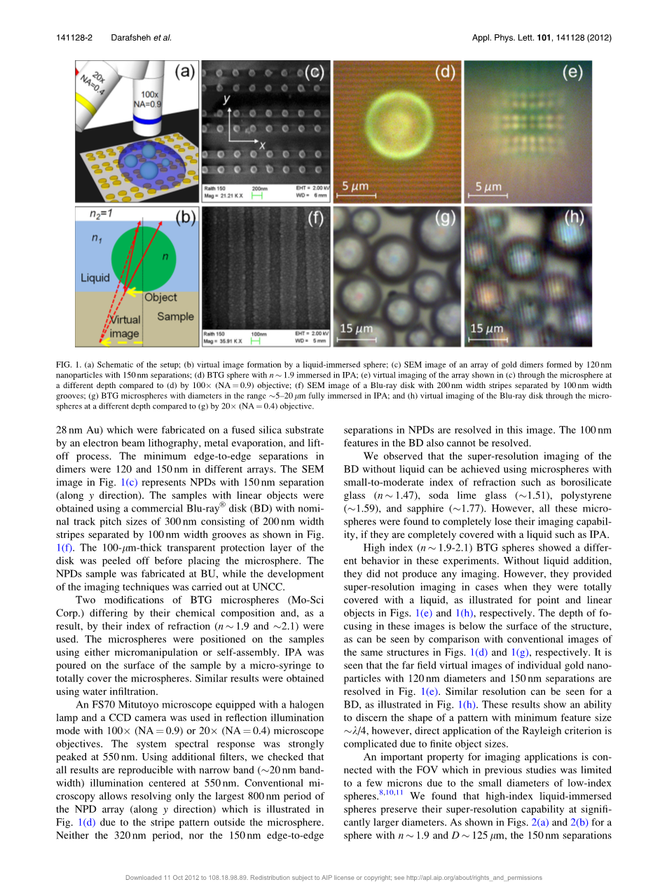 在实验中使用了BTG微球(Mo-Sci Corp.)的两种种类,它们的化学组成不同,因此其折射率也不同(n约为1.9和约为2.1),然后使用微操作或自组装将微球定位在样品上,其后用微注射器将IPA倒在样品表面上,以完全覆盖微球,水渗入也可以完成类似的条件。