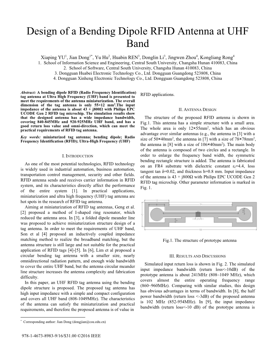 关键词:微型标签天线;弯曲偶极子;射频识别(RFID);超高频(UHF)