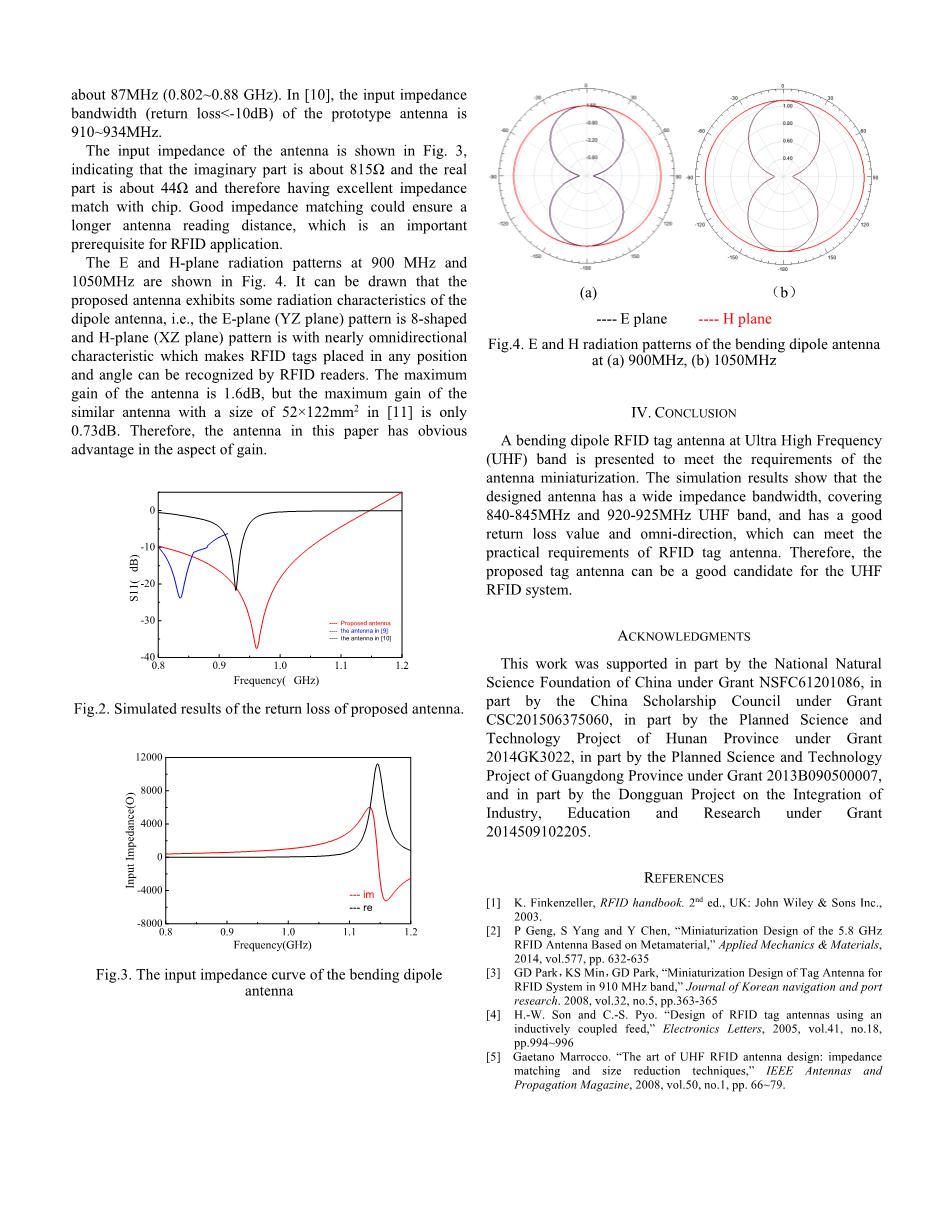 模拟输入回波损耗如图2所示。原型天线的模拟输入阻抗带宽(回波损耗lt;-10dB)约为241MHz(808~1049MHz),几乎覆盖了整个工作频率范围(860~960MHz)。与同类研究相比,该设计在带宽方面具有明显的优势。在引文8中,设计天线的半功率带宽(回波损耗lt;-3db)为102MHz(852-954MHz)。在引文9中,天线的输入阻抗带宽(回波损耗lt;-10db)为约87MHz(802~880MHz)。在引文中,设计天线的输入阻抗带宽(回波损耗lt;-10dB)为910~934MHz。天线的输入阻抗如图3所示,表明虚部约为815,实部约为44,因此与芯片具有良好的阻抗匹配。良好的阻抗匹配可以保证较长的天线读取距离,这是射频识别应用的重要前提。900MHz和1050MHz下的E面和H面辐射图如图4所示。可以看出,该天线具有偶极天线的一些辐射特性,即全向辐射特性,这样就可以使放置在任意位置和角度的RFID标签都能被RFID阅读器识别。天线的最大增益为1.6dB,在引文11中尺寸为52times;122 的天线的最大增益仅为0.73dB。因此,本文提出的天线在增益方面具有明显的优势。