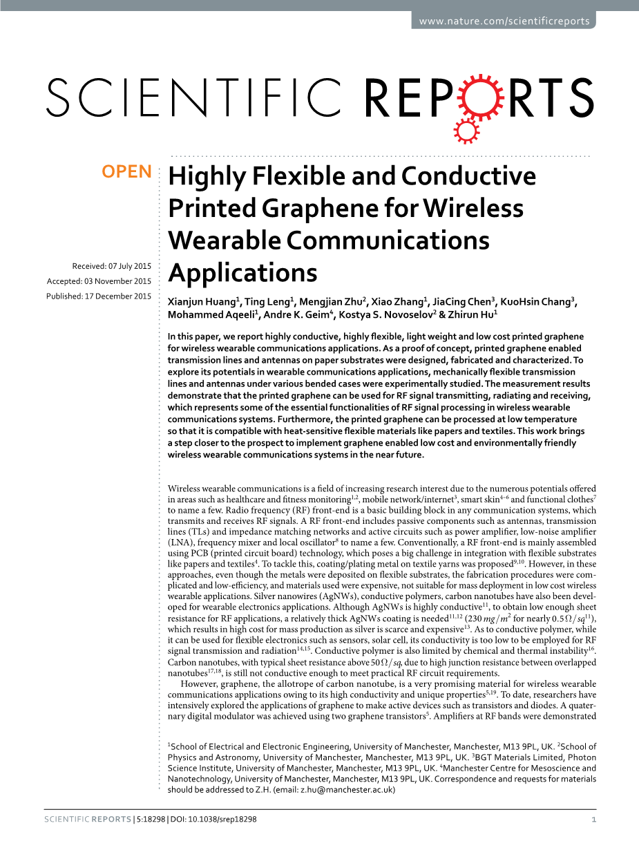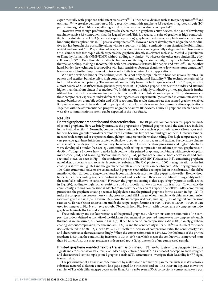 我们开发了一种无粘合剂技术,这种技术不仅与纸张和纺织品等热敏基材兼容,而且还具有高导电性和机械柔韧性。该技术适用于工业规模的丝网印刷。该技术测得的电导率达到4.3times;104thinsp;S / m,几乎是先前报道的还原氧化石墨烯(2.5times;104S / m)的两倍,比无粘合剂法的高10倍。在该报告中,这种高导电性印刷石墨烯还用于在诸如纸张的柔性基板上构造传输线和天线。这些部件的性能,特别是在不同的弯曲情况下,在通信频带,例如移动蜂窝和WiFi频谱中进行实验检查。结果表明,印刷的石墨烯使射频无源元件在无线可穿戴通信应用中具有良好的性能和质量。与上述石墨烯有源射频器件的进展一起,可以预期,在不久的将来能真正的实现石墨烯无线可穿戴通信系统。
