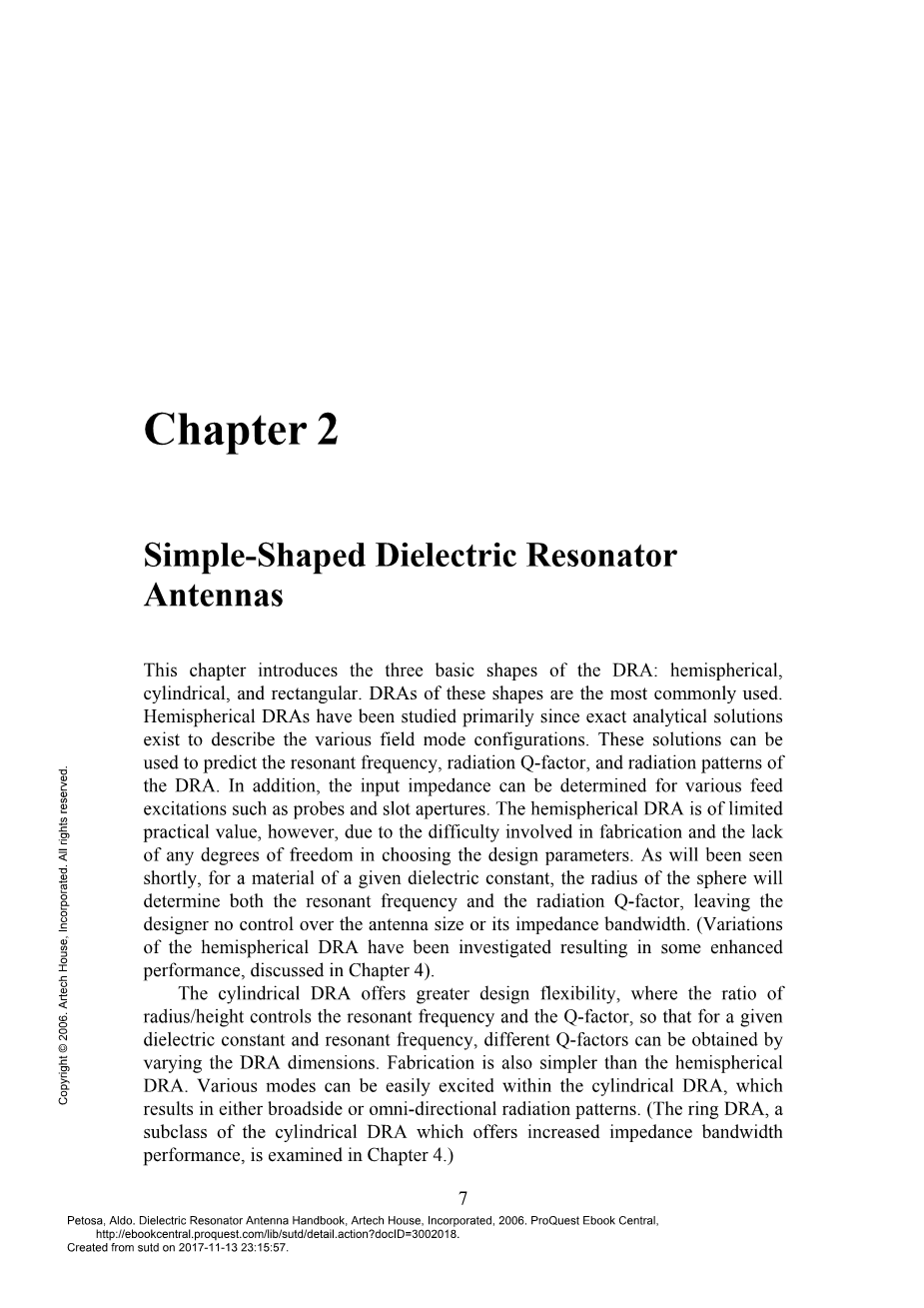 本章介绍了这些基本介质谐振天线的基础模式,并且提供了设计方程和曲线,用以计算它们的谐振频率和辐射因子Q。然而,这些设计没有考虑到在一定程度上加载到介质谐振天线上的耦合机制和激励,这通常会导致谐振频率的偏移和辐射因子Q的改变。同时,对于辐射模式也有一定的影响,尤其是在交叉极化层次。第三章将会讨论馈电耦合。这个章节的设计提供一个起点,可以快速确定工作在特定频率下介质谐振天线的近似尺寸,并且提供了预期的带宽的指示。
