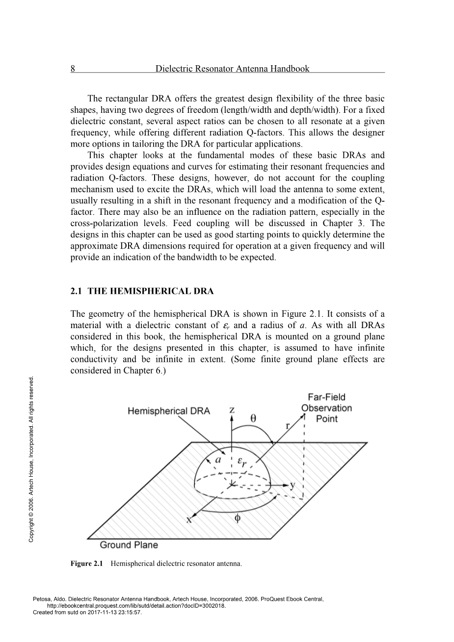 半球形介质谐振天线几何结构如图2.1所示。它由介电常数为Er、半径为a的材料组成。与本书中所考虑的所有介质谐振天线一样,半球形介质谐振天线被安置在接地平面上。在本章所呈现的设计中,都假设该地平面具有无线导电性和无限延伸性(在第六章有讨论一些有限地平面所产生的影响)。
