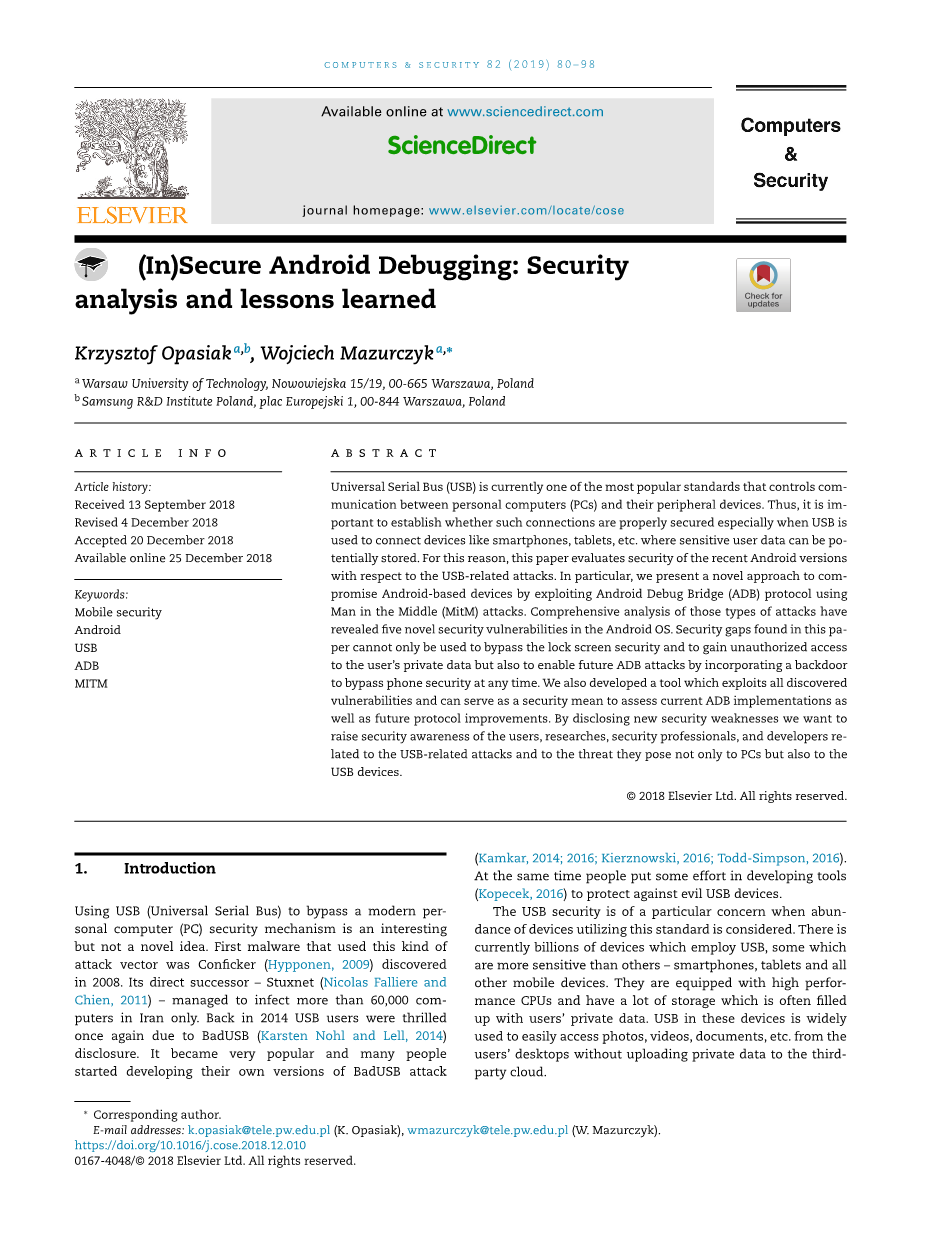 随着Android开发者和爱好者社区的不断涌现,越来越多的人开始使用亚行。他们中的许多人只激活一次,然后忘记稍后禁用它。在这种情况下,他们唯一的保护是安全USB调试功能。据作者所知,目前尚无对此机制的安全性分析。因此,本文的主要贡献是通过从USB连接角度评估安全USB调试的安全性来填补这一空白。这通过以下方式实现: