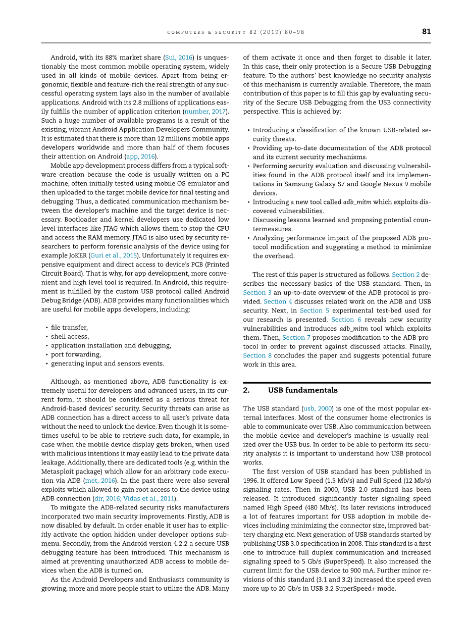 虽然如上所述,ADB功能对于开发人员和高级用户非常有用,但就其当前形式而言,它应被视为基于Android的设备安全性的严重威胁。由于ADB连接可以直接访问所有用户的私有数据而无需解锁设备,因此可能会出现安全威胁。即使能够检索这样的数据有时是有用的,例如,当移动设备显示器被破坏时,当与恶意用户一起使用时,它可能容易导致私人数据泄露。此外,还有专用工具(例如,在Metasploit包中),允许通过ADB执行任意代码(met,2016)。在过去,还有一些漏洞允许使用ADB连接获得对设备的root访问权(dir,2016; Vidas等,2011)。