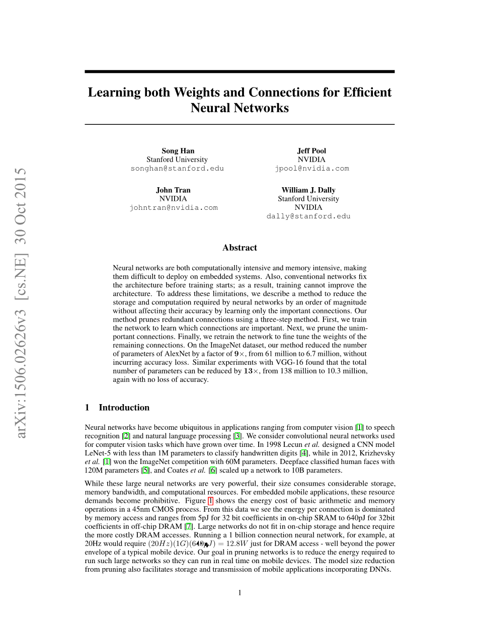 神经网络的计算量和存储量都是比较大的,这使得在嵌入式设备上使用它们变得比较困难。而且,卷积神经网络在网络训练的开始阶段就已经固定了其网络结构,之后的训练并不会改善它的结构。为了解决这些问题,我们提出了一种可以大量减少神经网络的计算量和存储量的方法,这种方法的主要思想是只学习网络中比较重要的连接,而不学习非重要的连接,并且这种方法对最后的准确率并没有什么影响。我们的方法通过三个步骤来去除网络之中冗余的,不重要的连接。首先,我们训练网络,使其学习哪些连接是重要的,而哪些连接是不重要的。接下来,我们去除掉网络中这些不重要的连接。最后,我们保持剩余的网络连接不变,对其进行再训练,最终达到目的。在ImageNet数据集上,通过我们的方法,我们将AlexNet的连接数据量压缩了9倍,没有准确率的损失。另一个试验中,我们将VGG-16网络的数据量压缩了13倍,也没有准确率的损失。