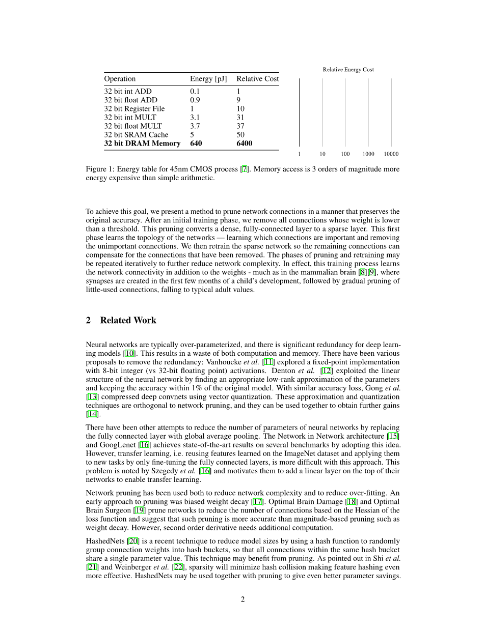 虽然这些神经网络是十分强大的,但是它们需要可观的存储空间,内存带宽和计算资源。对于嵌入式设备来说,这些资源是很难获得的。图一显示了在一个45 nm的CMOS处理器上的基本的算术运算和内存操作所需要的能量消耗。从这张图中我们可以看出每一个连接所消耗的能量是由内存读取的次数所决定的,从SRAM上的每32位5 pJ到DRAM上的每32位640 pJ之间不等。大型的神经网络显然不支持片上的存储,必须要用到能量消耗更大的DRAM。运行一个有1M连接的神经网络,如果时钟为20Hz的话,那么仅仅是DRAM上的读取操作就需要12.8W的功率,大大超出了可移动设备的可提供的能量功率。我们的目标是减少神经网络的能量消耗,使得其可以运行在实时的可移动设备上。通过我们的方法去除冗余连接的网络模型也更便于存储和传输。