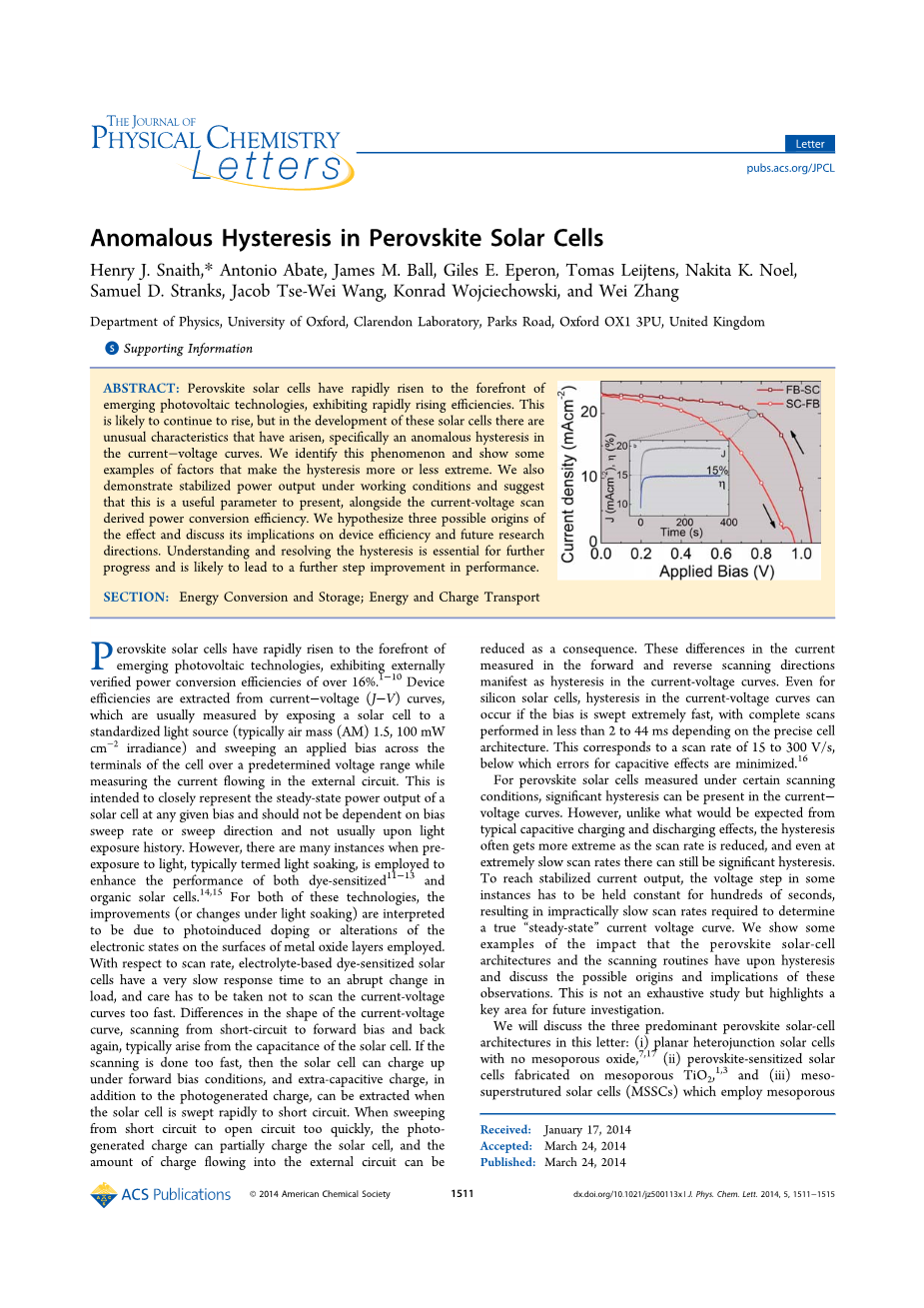 Henry J. Snaith,* Antonio Abate, James M. Ball, Giles E. Eperon, Tomas Leijtens, Nakita K. Noel,Samuel D. Stranks, Jacob Tse-Wei Wang, Konrad Wojciechowski, and Wei Zhang