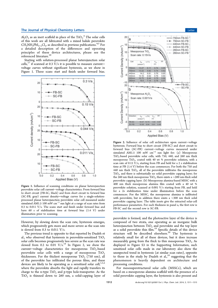 总结所有以前的数据,主要意见是: (1) 滞后主要源于在太阳能电池中钙钛矿型减振器的存在。(2)滞后是强烈地依赖于接触的材料,包括 p 型和 n 型联系人和介孔与平面的异质结。(3)上升时间,达到稳定的功率输出是非常缓慢,大约 100 秒。(4) 减缓下来扫描率普遍增加而不是减少,不同程度的滞后取决于平面异质结太阳能电池在给定范围的扫描速率,但最终在任何情况下仍然存在滞后,无论历史如何达到稳定状态。