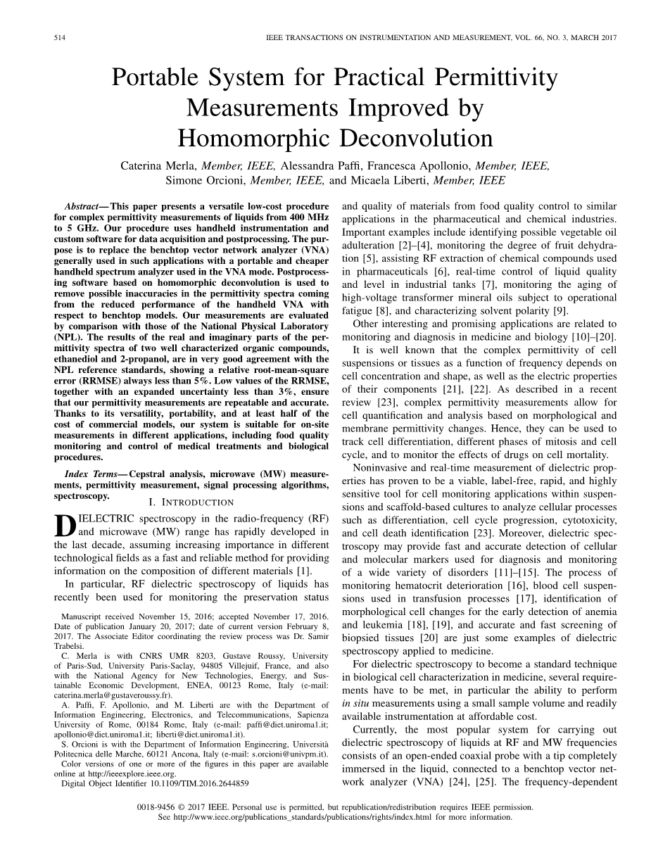 在这篇文章中,我们提出了一种方法,用以克服关于便携式仪器使用的可能的关键方面(见第III-A节),用于液体的复介电常数的测量。 我们的方法改进了系统功能,因为使用差分原理[26],[27]消除了对标准校准的需要(参见第III-B节)。除此以外,以同态反卷积为基础的定制的后处理软件的开发(参见第III-C节)使我们能够通过消除由于手持式矢量网络分析仪(VNA)性能降低而导致的可能错误来获得准确的结果。