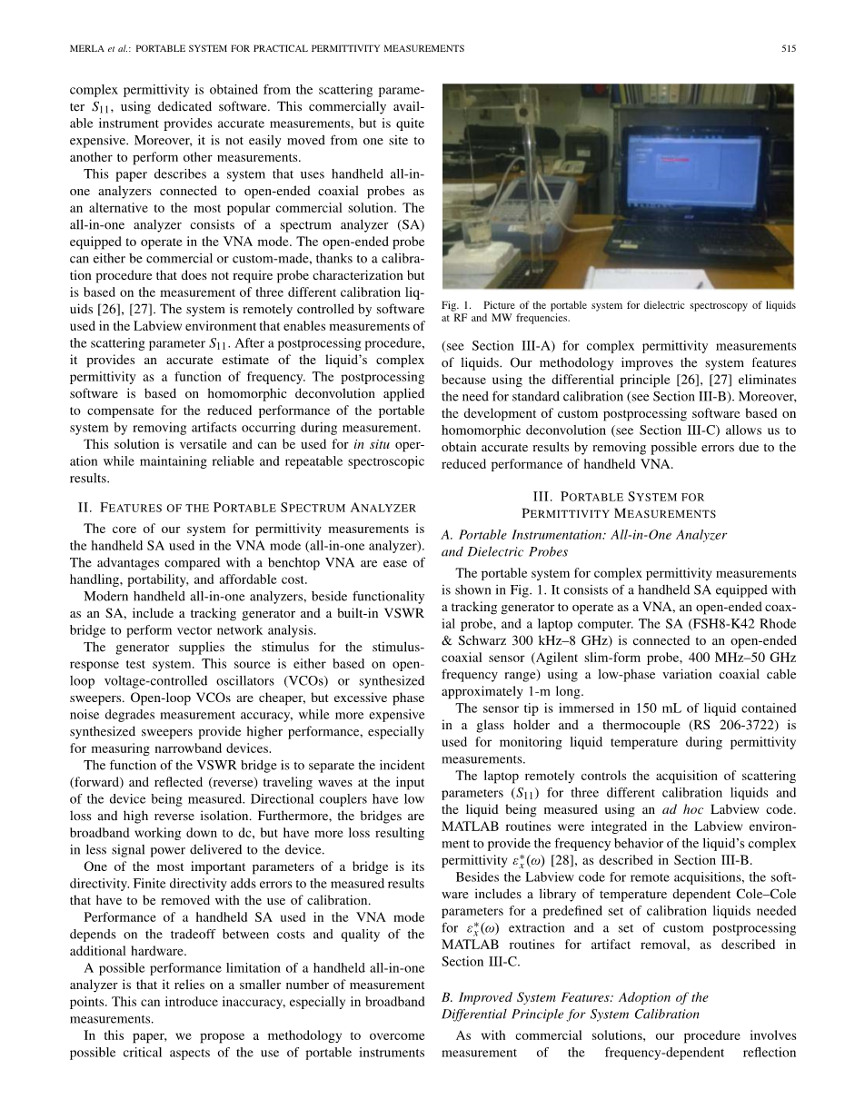 本文描述了一种系统,该系统使用了连接到开放式同轴探头的手持式全内置分析仪作为最流行的商业解决方案的替代方案。一体化分析仪由配备在矢量网络分析仪(VNA)模式下运行的频谱分析仪(SA)组成。由于校准程序不需要探头来表现特征,但以三种不同校准液的测量为基础,开放式探头既可以是商用的也可以是定制的[26],[27]。该系统由Labview环境中使用的软件进行远程控制,该软件能够测量散射参数S11。在经过后处理程序之后,它提供了作为频率函数的液体复介电常数的准确估计。后处理软件以同态反卷积为基础,应用于通过去除测量期间发生的人为的误差来补偿便携式系统的降低的性能。