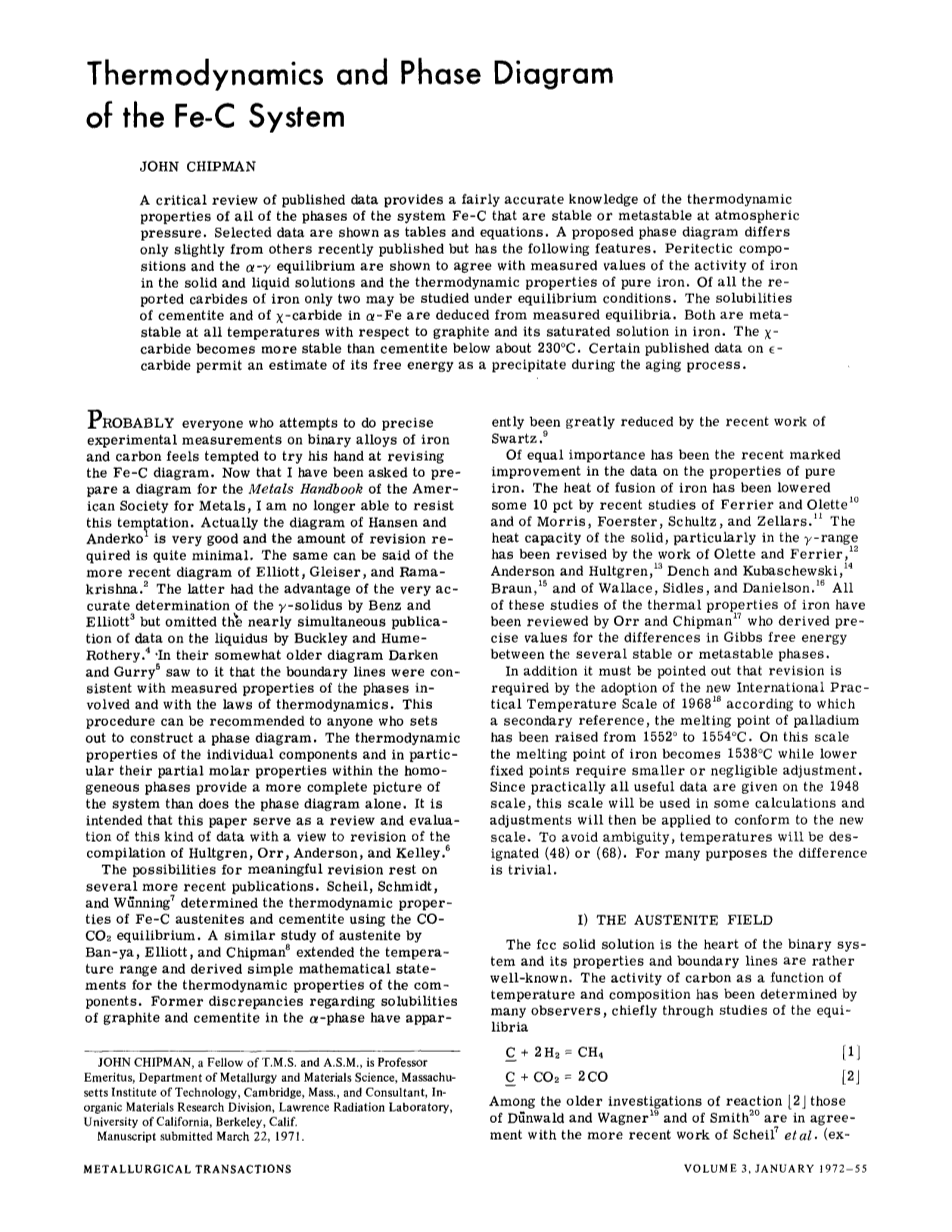 也许每一个尝试对铁碳的二元合金做精确实验测定的人都想试着修改铁碳系统相图。既然我已经被美国金属协会金属手册准备一份相图,我自然无法抵挡住这个诱惑。实际上汉森和安德科的相图已经已经非常好了,需要校对的工作量也非常少。最近由埃利奥特、格莱泽和罗摩克里希纳发表的相图同样如此。后者有着由本茨和埃利奥特对gamma;固相线非常精确测定的优势但是忽略了最近同时由巴克利和休谟-罗瑟里发表的液相数据。在稍微旧一点的相图中,达肯和久雷一定要边界线和涉及的相变性质及热力学定律相一致。这个步骤推荐给任何准备着手去构建相图的人。单独成分的热力学性质和尤其是它们在同类相变下的部分摩尔性质提供了比单一相图更加完整的系统图。目的是这篇论文可以以一个修正的赫尔特伦、奥尔、安德森和凯利的编著的视角作为此类数据的报告和评估。有意义的修正的可能依赖于许多最近发表的论文。沙伊尔、施密特和吴宁利用CO-CO2平衡体系测定了Fe-C奥氏体和碳化三铁的热力学性质。班亚、埃利奥特和奇普曼扩大了温度范围,得到了简单的关于成分的热力学性质的数学报告。之前关于石墨和奥氏体在alpha;相图中的矛盾因为斯沃茨的最近的成果大大的、减少了。最近在纯铁性质的数据的显著提高同样重要。由于费里尔、奥莱特、莫里斯、福尔斯特、舒尔茨、泽拉斯最近的研究,铁的溶解热已经降低了百分之十。固体在gamma;范围中的热熔已经被奥莱特、费里尔、安德森、格特林、丹契、库巴舍夫斯基、布劳恩、华莱士、赛多兹、丹尼尔森的研究特别地修正了。所有这些关于铁的热力学性质的研究已经被奥尔和奇普曼修正过了,他们得出了在许多稳态和亚稳态之间不同于吉普斯自由能的精确值。而且必须要指出的是,修正是1968年国际实用温标根据第二参考要求的做出的。金属钯的熔点已经被提高到了1522到1544摄氏度。在这个标准下,铁的熔点变成了1538摄氏度,尽管在固定点以下需要很小或者可以忽略不计的调整。因为全部有用的数据在1948年的标准中几乎都给出了,这个标准将会用于一些计算和调整中,然后应用于去服从新的标准。为了避免歧义温度会被指定为48或者68,由于用途广泛差别是微不足道的。