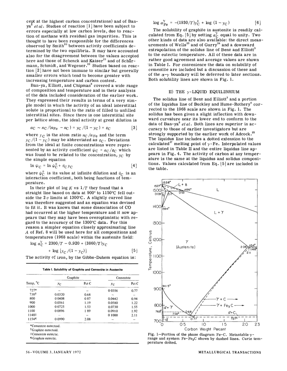 fcc固溶液是二元系统的核心,它的性质和边界线是为人熟知的。碳反应是温度的函数,成分组成已经被许多研究者测定了。主要是通过平衡态的研究进行的。在之前对反应2的研究当中,邓瓦尔德、瓦格纳和史密斯的研究和近期沙伊尔等人及班亚等人研究的成果一致。(除了在最大的碳浓度处不同)。由于甲烷和残留气体的掺杂,尤其是在低碳浓度时,反应1的研究服从误差。这被认为是两种平衡态下由史密斯研究测定的反应系数不同的原因。这也许已经解释了为什么在此接受的值和那些由申克、开希尔及舒尔曼、施密特、韦格纳的值不同。反应2的研究受到的影响类似,但是总体来说较小的误差在增加温度和碳含量时会趋向变大。班亚、埃利奥特、奇普曼的研究覆盖了很大的构成和温度范围,在他们的数据分析中包括了对早期研究的考虑。他们根据一个非常简单的模型表述了他们的结果,在这个模型中一个理想间隙溶质的反应和填充与未填充间隙点的比例是均衡的。因为每个栅格原子有一个间隙点,理想反应在很大稀释时的原子比例是nC/nFe,式子yC/(1-yC)可以缩写为zC。理想有限浓度的绝对误差由反应系数psi;C=aC/zC得到,发现它和浓度相关,yC是由简单的方程4得到的. psi;C0是在无限稀释时的值,theta;C是一个相互作用系数,两者都是温度的函数。在logKvs1/T表中,他们发现了基于900到1150摄氏度数据的直线在13000摄氏度时超出了2sigma;的极限。因此一条略弯的被表示出来,设想了一个方程去拟合它。很明显CO在较高温度时出现了一些分离。现在表明他们可能对关于1300摄氏度数据的精确过于乐观了。因此在奥氏体领域对所有的构成和温度(1968年标准)将会采用一个高度近似Ref8的直线A的更简单的方程5,铁的反应吉布斯杜亥姆方程是6.石墨在奥氏体中的溶解度在方程5中把aCgamma;设为1轻而易举的计算出来了。同时得到了其他两种数据:威尔斯和居里的直接测量值及本茨和埃利奥特对共熔温度的固相线的进一步推测。所有的数据都是非常相符的,平均值在表I中。为了方便碳化三铁溶解度的数据也包括在内,但是关于这些数据和alpha;﹘gamma;边界将会在后续部分作出讨论。两者的溶解度线在图1中。