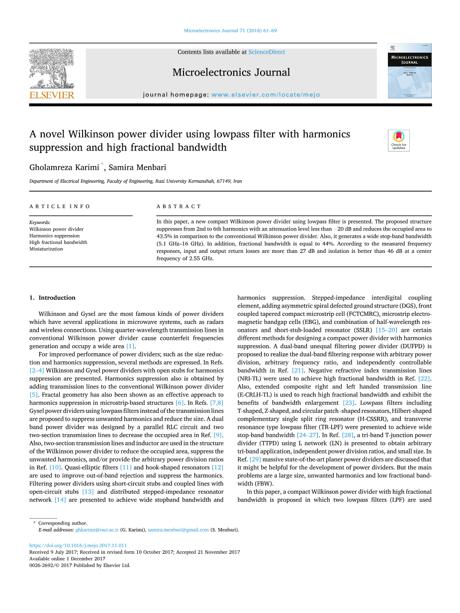 采用谐波抑制和高分数带宽低通滤波器的新型威尔金森功率分配器