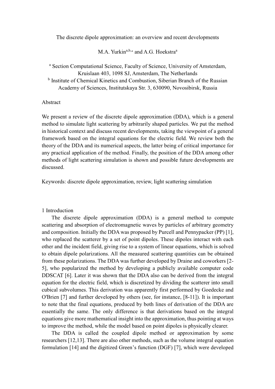 本文综述了离散偶极子近似(DDA)方法,这是一种模拟任意形状粒子散射光的通用方法。我们将该方法置于历史背景中,并从电场积分方程的一般框架的观点讨论了最近的发展。我们回顾了DDA的理论及其数值方面,后者对于该方法的任何实际应用都是至关重要的。最后,指出了DDA在光散射仿真方法中的地位,并对今后可能的发展进行了讨论。