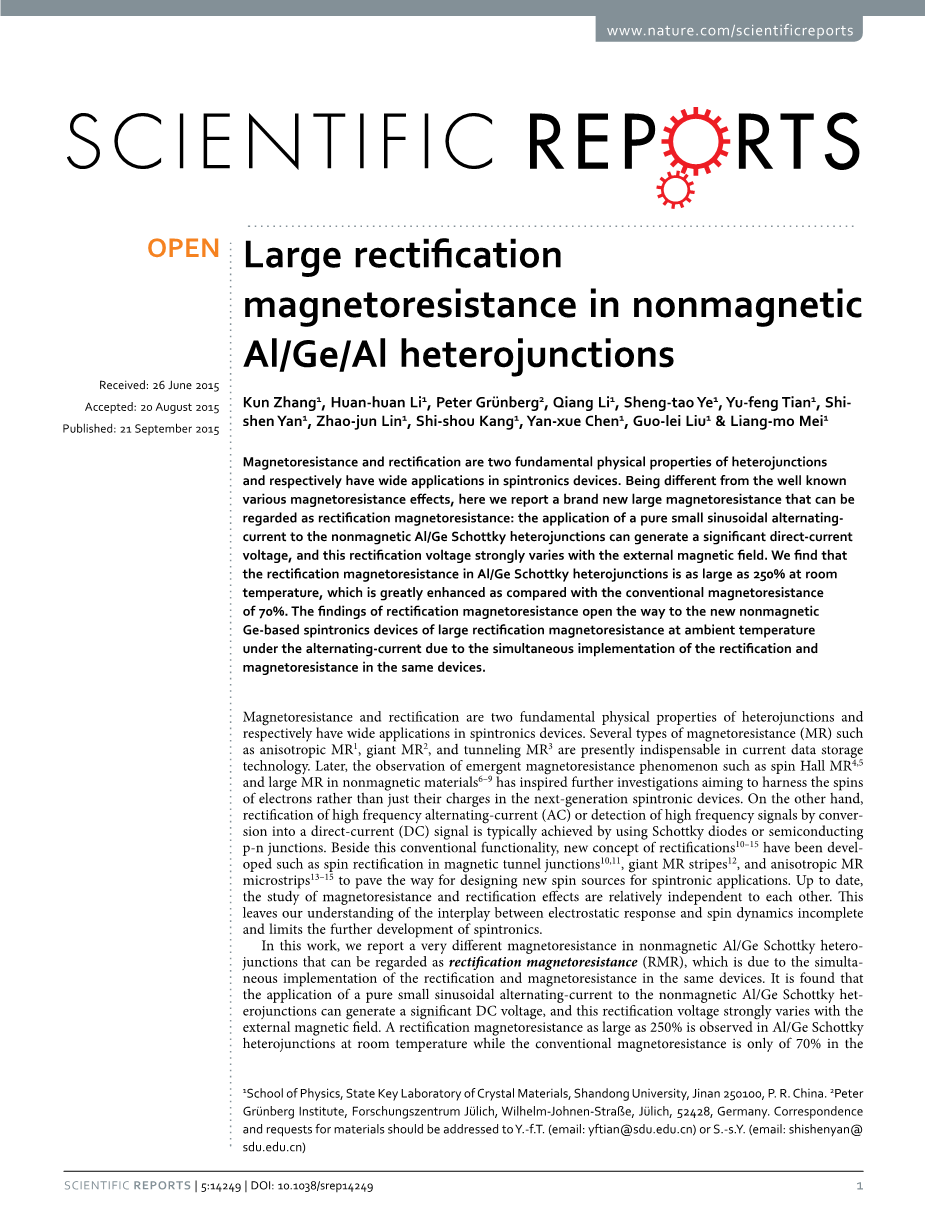 作者:Kun Zhang, Huan-huan Li, Peter Gruuml;nberg, Qiang Li, Sheng-tao Ye, Yu-feng Tian, ShishenYan, Zhao-jun Lin, Shi-shou Kang, Yan-xue Chen, Guo-lei Liu amp; Liang-mo Mei