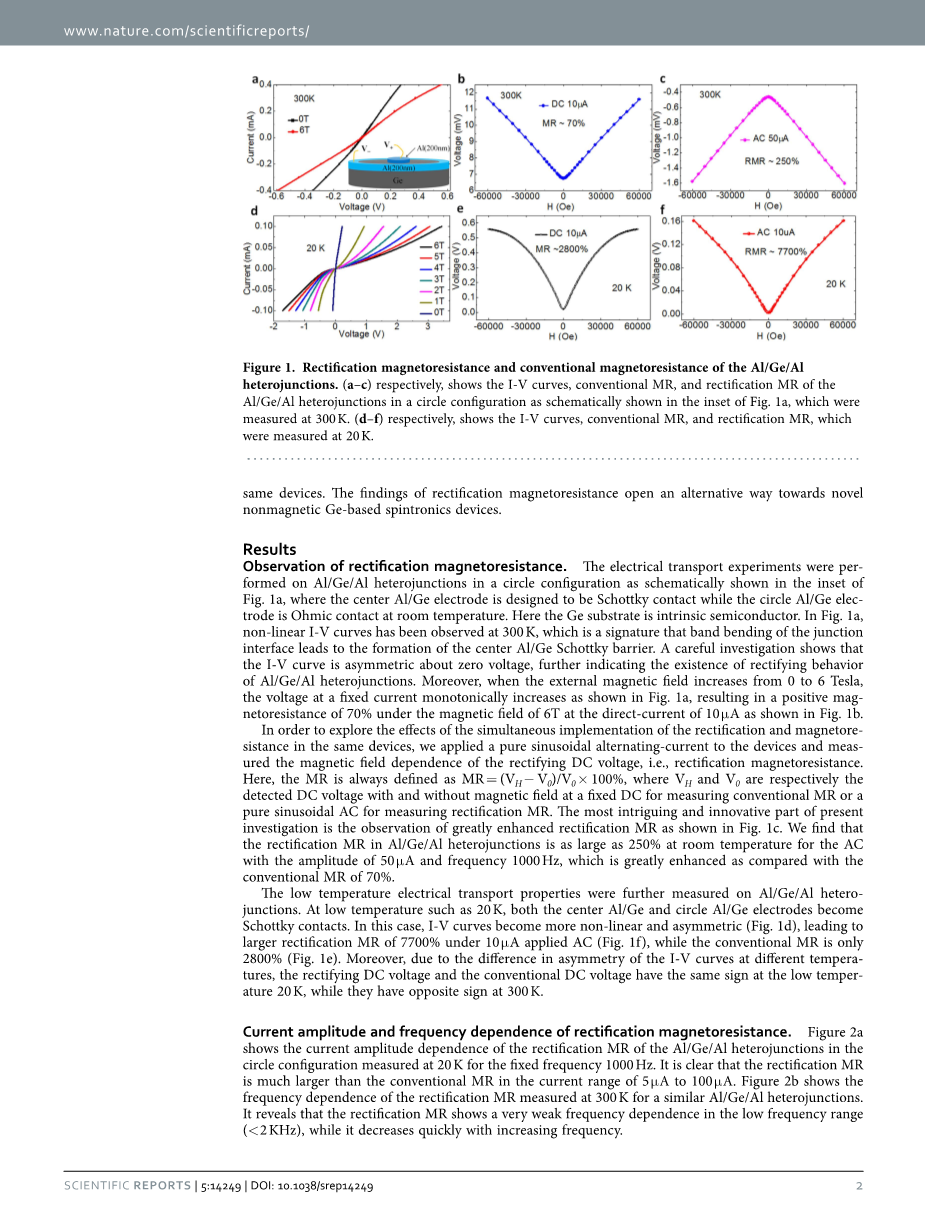 磁电阻和整流是异质结的两个基本物理特性,并且分别在自旋电子器件中具有广泛的应用。与众所周知的各种磁阻效应不同,这里我们报告一种全新的大磁阻,可以看作整流磁阻:在非磁性Al / Ge肖特基异质结上施加纯小正弦交流电可以产生显着的直流电压并且该整流电压随外部磁场强烈变化。我们发现Al / Ge肖特基异质结中的整流磁阻在室温下高达250%,与70%直流磁阻相比,这大大提高了。整流磁阻的研究结果为在环境温度下在交流电下大型整流磁阻的新型非磁性Ge基自旋电子器件开辟了道路,因为在同一器件中同时实现了整流和磁阻。