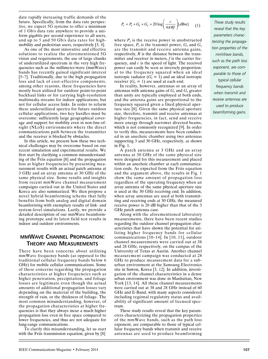 虽然在韩国和美国(10—14)的作者正在进行更广泛的测量活动,以建立一个综合的统计毫米波信道传播模型,但是很明显,毫米波频带作为下一代蜂窝服务的候选频带具有很强的潜力。在验证信道可行性之后,下一步是开发底层核心技术,以最有效地利用毫米波频带中丰富的频谱,并证明商业可行性。我们描述了毫米波波束形成算法作为一个关键的推动者,以实际获得和管理蜂窝环境中的高波束形成增益,其次是我们的毫米波原型及其性能的详细描述。