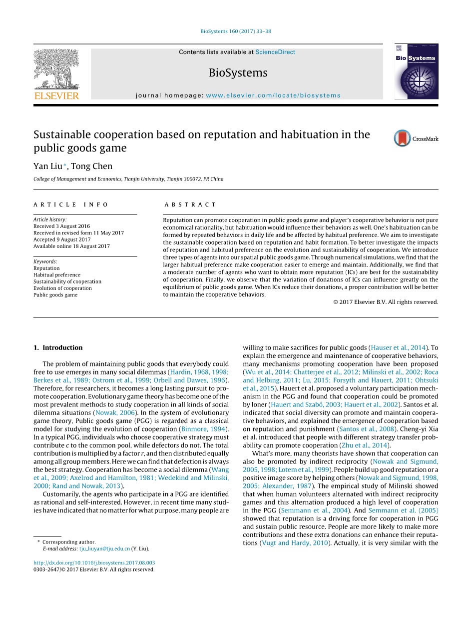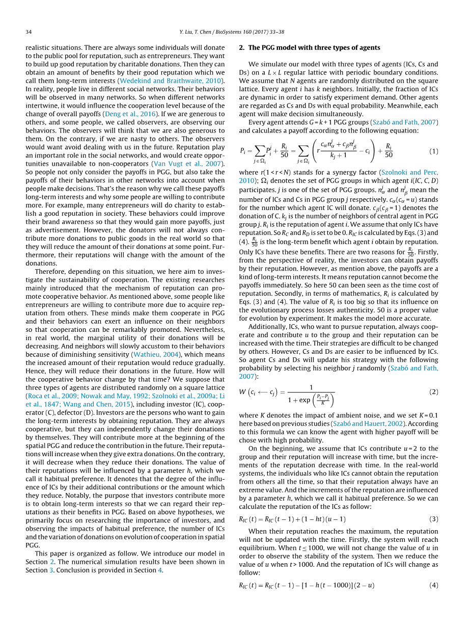 习惯上,参与公共产品博弈(PGG)的agents都被认定为理性和利己主义者。然而,最近很多研究表明,无论出于何种目的,许多人都愿意为公共物品作出牺牲(Hauser et al.,2014)。为了解释合作行为的产生和维持,已经提出了许多促进合作的机制(Wu et al., 2014; Chatterjee et al., 2012; Milinski et al., 2002; Rocaand Helbing, 2011;Lu,2015;Forsyth and Hauert, 2011; Ohtsukiet al.,2015)。Hauert等人提出了PGG的自愿参与机制,并发现合作可以由孤独者推动(Hauer and Szaboacute;,2003;Hauert et al.,2002)。Santos等人指出,社会多样性可以促进和保持合作行为,并解释了基于声誉和惩罚的合作的产生(Santos et al.,2008)。Cheng-YiiXia等人介绍了有不同策略转移可能性的人可以推动合作(Zhu et al.,2014)。