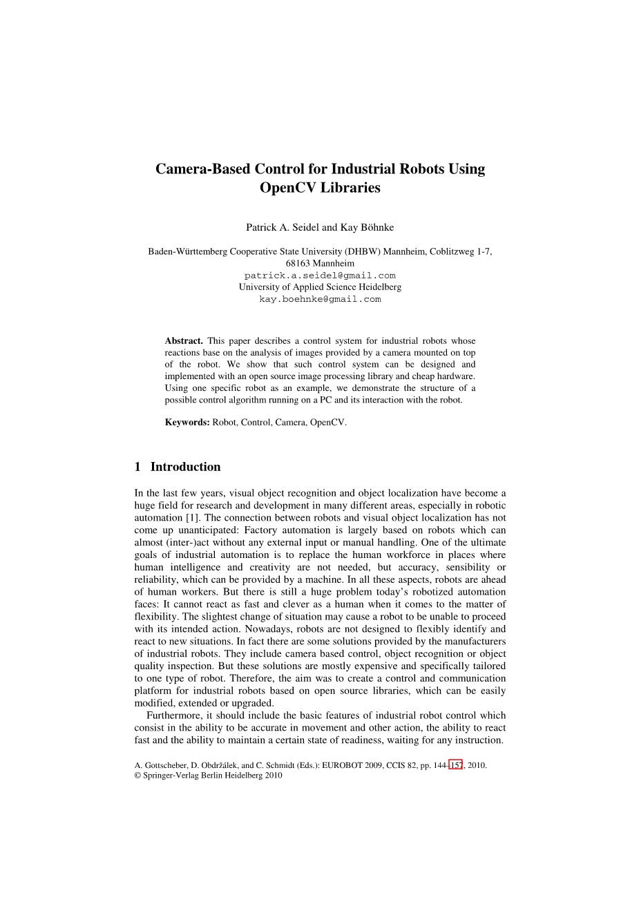 本文描述了使用开源图像库进行图像处理(英特尔OpenCV)的工业机器人基于摄像头的控制的主要思想,实现和进一步扩展。在这种情况下,带有Motoman XRC控制单元的工业机器人安川SV3可以实现这一功能,但可以轻松应用于几乎任何其他带有个人计算机接口(例如EIA-232,USB或FireWire)的工业机器人。