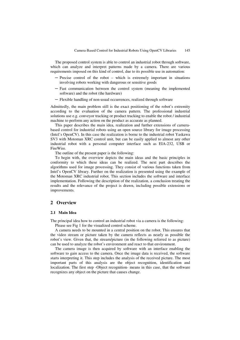 首先,概述描述了符合这些想法可以实现的主要思想和基本原则。下一部分描述用于图像处理的算法。它们由来自英特尔OpenCV库的各种功能组成。进一步的实现是使用Motoman XRC工业机器人的例子。本节包含软件和接口实现。根据对实现的描述,得出结论和项目的相关性,包括可能的扩展或改进。