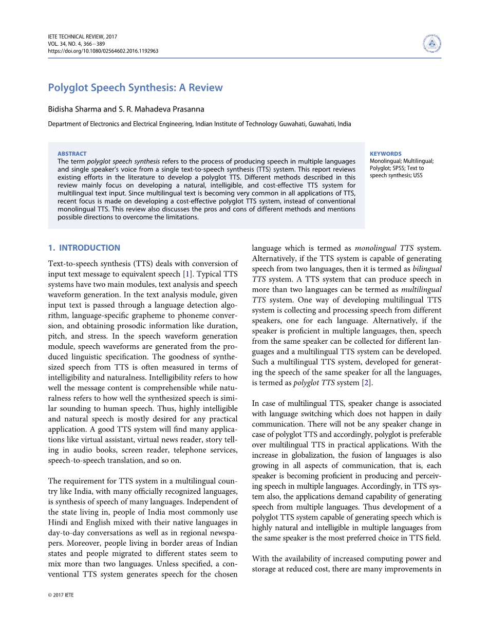 随着计算能力的提高和以较低的成本存储,有很多改进过去二十年来对TTS的研究。这些在自然性,可懂度方面的改进,使用资源少,时间少。这两个最受欢迎方法是连接合成,更多资源消耗,但提供更多的自然性,和统计参数语音合成(SPSS)较少足迹,其自然性较差[3]。简要下一节将介绍对这些方法的回顾。在谈到多语言TTS时,非常一个人想到的第一个想法就是切换几种单语言TTS系统[2],带语言切换输入文本。在这种情况下,单语TTS系统使用统一框架开发。其中一个发展是贝尔实验室TTS系统[4]。这个一种多语言的TTS可能有助于合成一个话语只有一种语言的文本。如果通过这样的TTS合成多语言话语,那么合成语音将通过语音切换进行扬声器切换。随着扬声器的变化,那里可能会切换扬声器和语言特定的专业参数,这是不可取的并且非常不合理。为了避免这些困难,另一种方法是用多语言扬声器记录数据库[2]。一个真正的多语言演讲者是能够制作的人使用电话清单和韵律参数的演讲所选语言但如果说话者不完整多语言,合成的合成语音将是重音[5]。此外,很难找到多语言说话人的语言数量增加。为了合成多个语言在同一话语中的文本,多语言TTS可以不太好用。因此,为了处理多语言的完整性,需要多语言TTS。
