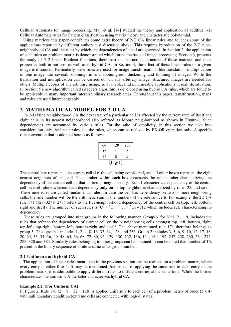 使用矩阵本文提供了一些额外的二维CA线性规则理论,并且涉及到上面讨论过的不同作者报告的一些应用。这需要引入二维九邻域CA以及影响单元依赖关系的规则。第二节中,这种规则在问题矩阵上应用被证明是形成图像处理的基础。第3节,介绍了512个线性布尔函数,其矩阵构造,结构和它们的属性在均匀以及混合CA中的研究。在第4节中,讨论了这些线性规则对给定图像的影响。特别地,这些规则用于图像转换,例如平移,将一幅图像复制为多幅图像,放大和缩小,图像增厚和变薄。虽然可以在任何任意图像上执行平移和复制,但是对于其他变换则需要结构化图像。任意图像的多个副本,如此可用,可以在现实生活中找到无数的应用。在第5节中,使用混合CA规则开发了称为扫描器算法的新算法,其被发现适用于许多重要的跨学科研究领域。 在本文中,转换,地图和规则可互换使用。