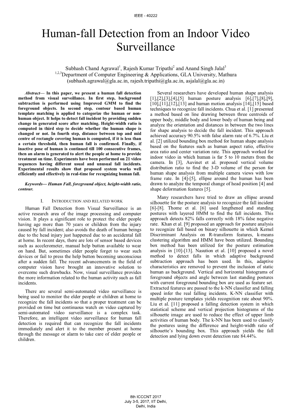 几位研究人员已经开发出基于人体形状分析[1],[2],[3],[4],[5]人体姿势分析[6],[7],[8],[9],[10],[11],[12],[13]和人体运动分析[14],[15]来识别跌倒事件的技术。Chua等,在文献[1]中提出了一种方法基于人上半身,身体中部和下半身的三个质心之间的线条,分析两条线之间的方向和距离,以进行形状分析来确定跌倒事件。该方法达到了90.5%的准确度,错误警报率为6.7%。刘等,在文献[2]中利用边框法根据人的纵横比,有效面积比和中心变化率等特征进行人形分析。这种方法适用于室内视频,人与摄像机之间的距离大约为5到10米。在[3]中,Auvinet等人,建议的垂直体积分布比,以从低帧数的多个摄像机视图中找到用于人体形状分析的3-D体积。在[4]-[5]中,在人体轮廓外绘制了椭圆形,以分析头部位置的时间变化[4]和形状变形特征[5]。